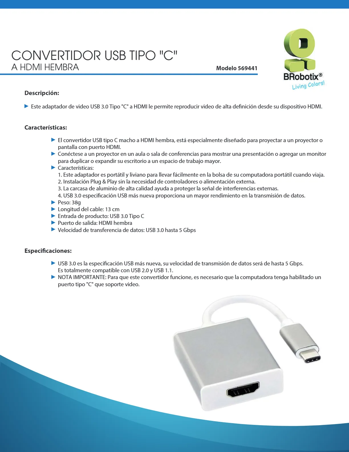 Convertidor De Video BROBOTIX / USB-C A HDMI Hembra / 13Cm / Gris-Blanco