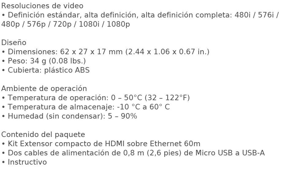 • Extiende una señal HDMI hasta 60 m (196 pies) de una fuente HDMI a una pantalla usando un cable Ethernet Cat6