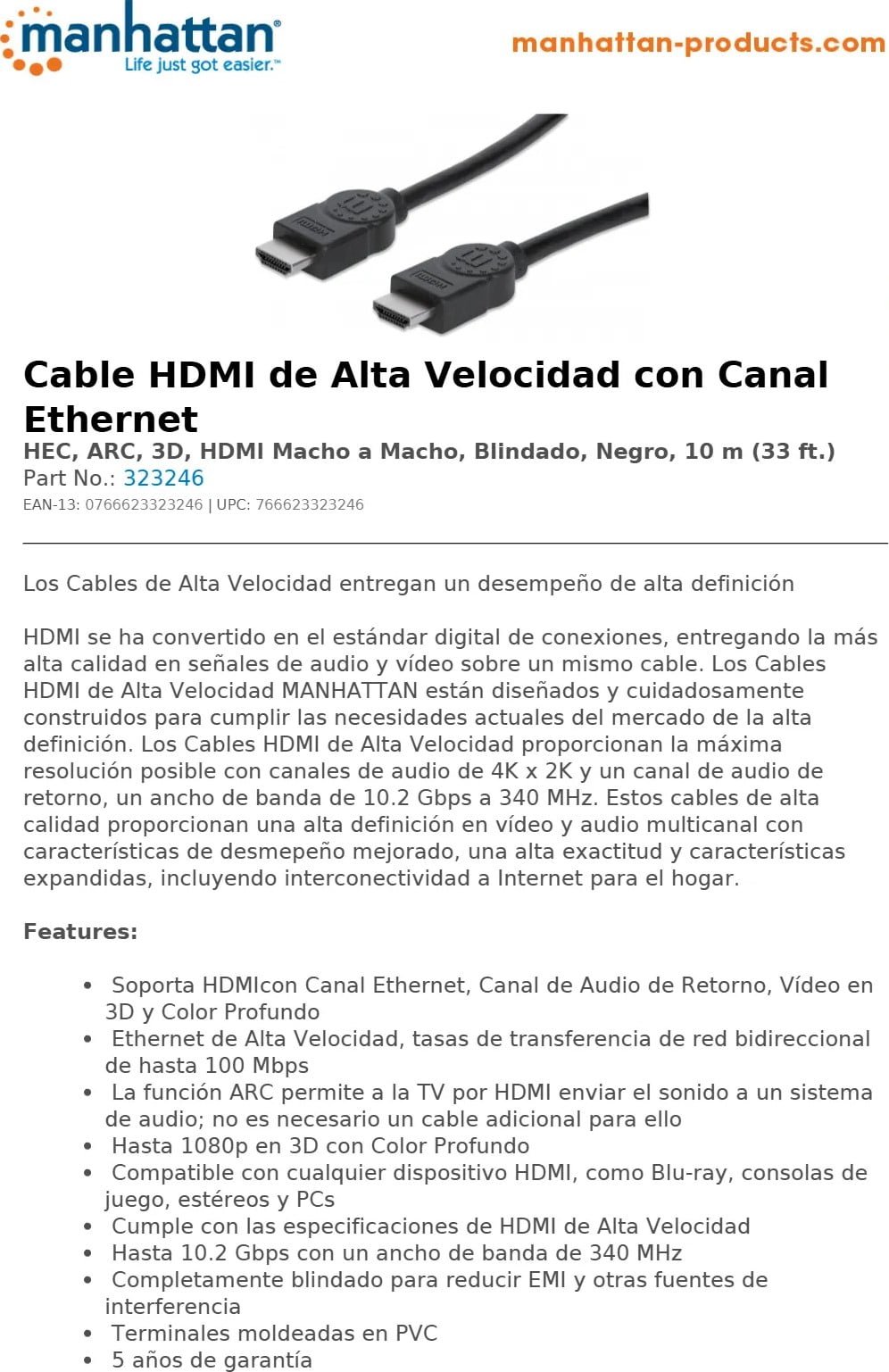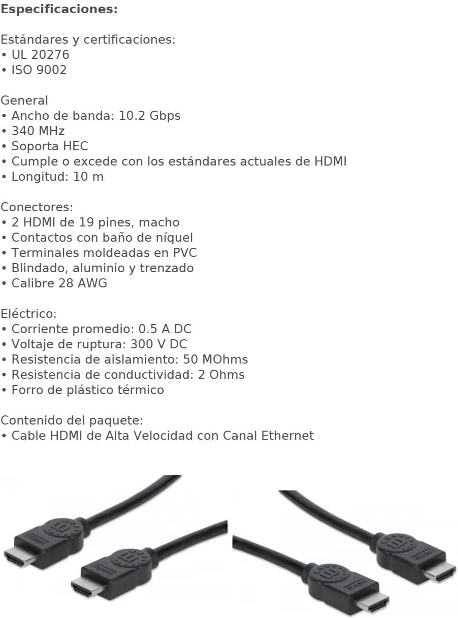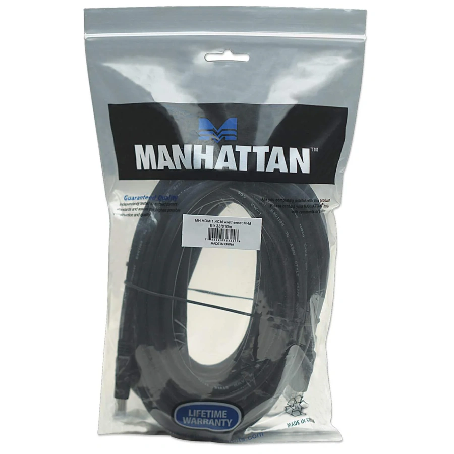 Cable HDMI MANHATTAN 323246 / De Alta Velocidad / Ancho De Banda 10.2Gbps / Macho A Macho / Blindado / 10M / Color Negro