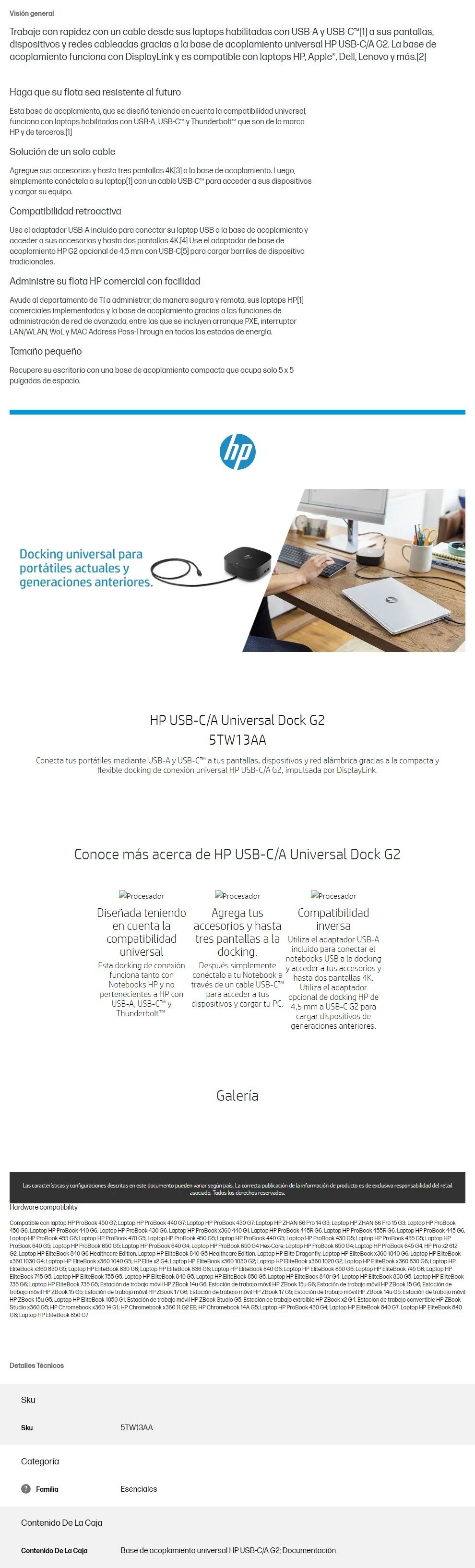 Docking station 10 en 1 HP USB-C G2 / 10 Puertos / USB-C / X4 USB-A, X2 DisplayPort, X1 HDMI, X1 USB-C, X1 3.5 MM, X1 RJ45 / Compatible Con Múltiples Equipos HP Y De Otras Marcas / Incluye Adaptador USB-C A USB-A / Color Negro
