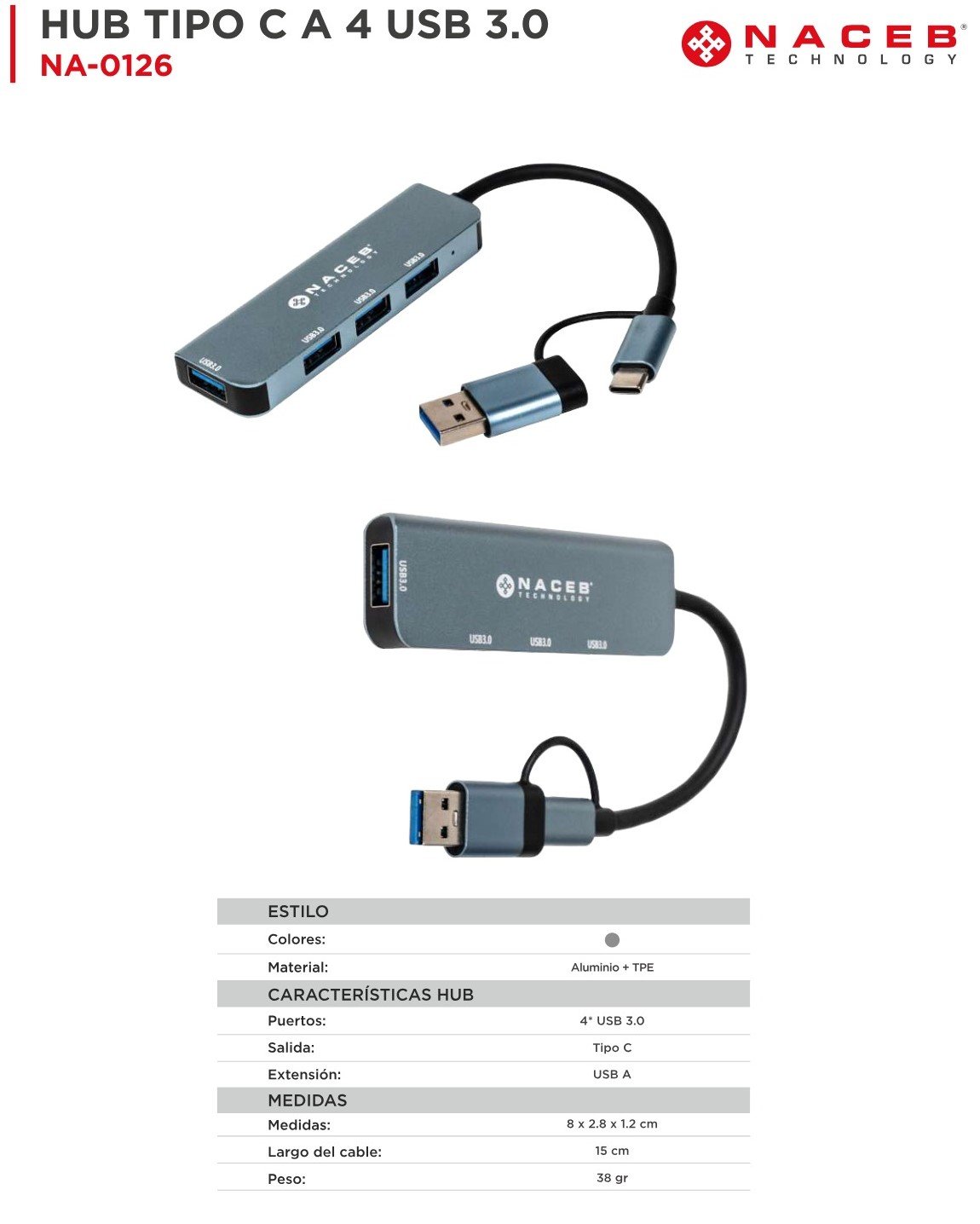Hub NACEB Tipo C a 4 USB 3.0