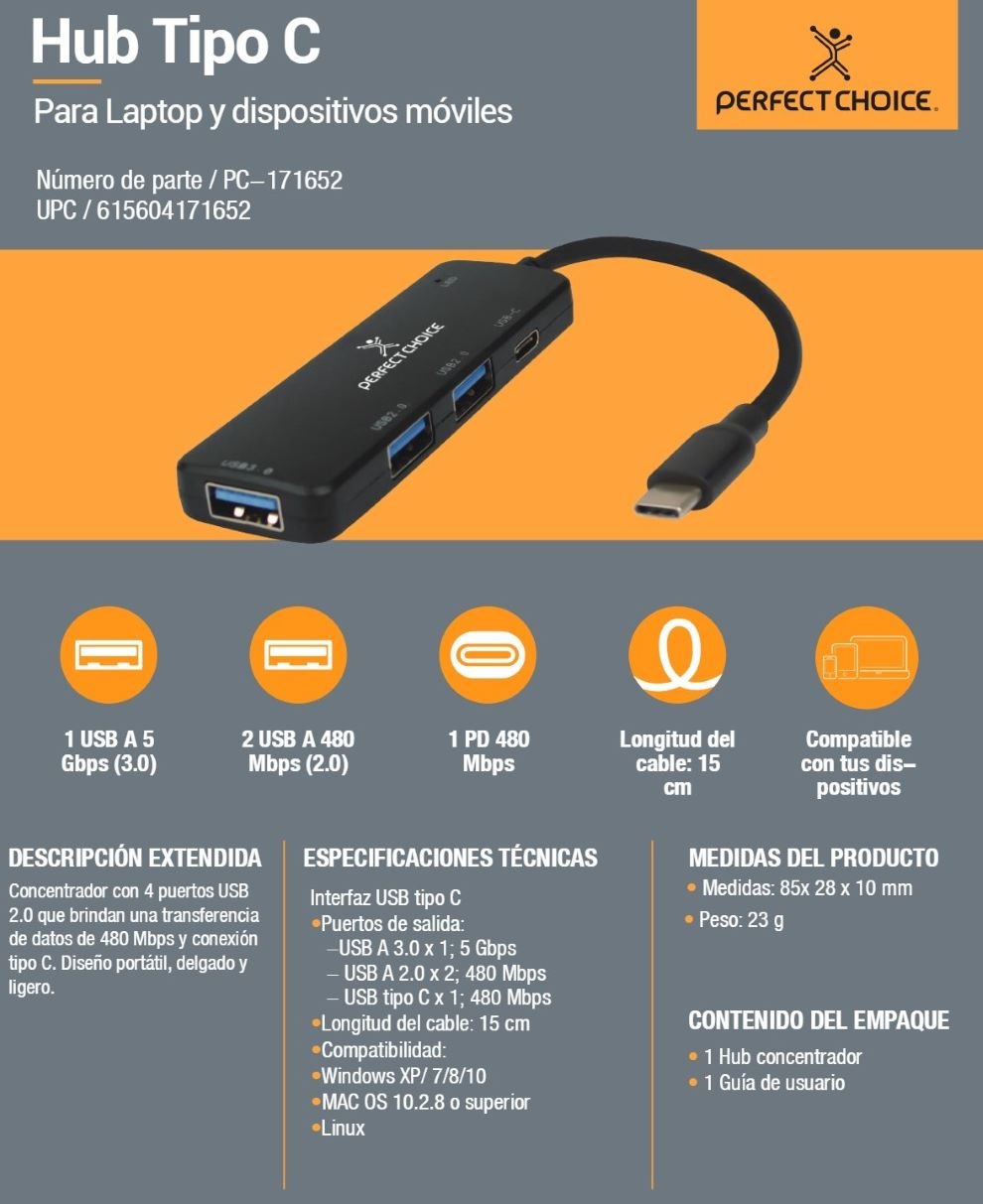 Hub Tipo C PERFECT CHOICE / X1 USB-A 3.0, X2 USB-A 2.0, X1 USB-C / 15 Cm / Color Negro
