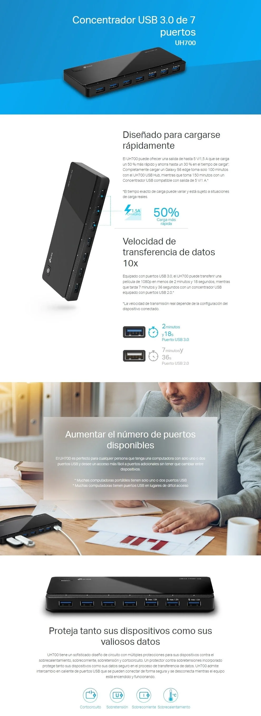 HUB TP-LINK UH700 / USB / 1 Puerto Micro USB 3.0 / 7 Puertos USB 3.0 / Compatible Con USB 2.0 Y 1.1 / Negro