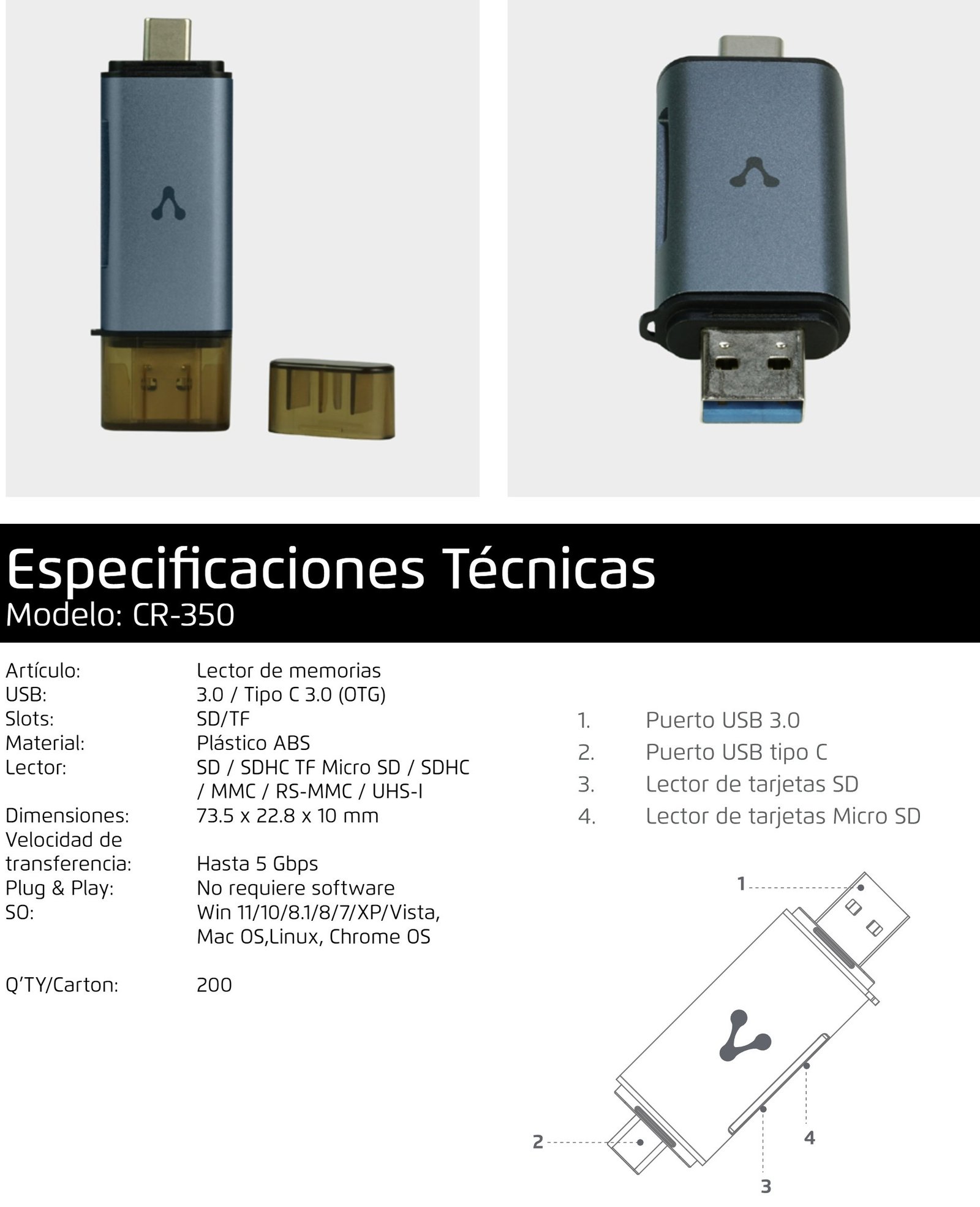 • El CR-350 se conecta fácilmente a una amplia variedad de dispositivos, desde laptops y PCs hasta smartphones y tablets, ya que cuenta con salidas USB tipo A 3.0 y USB tipo C, para que transfieras datos rápida y eficientemente, ahorrando tiempo.