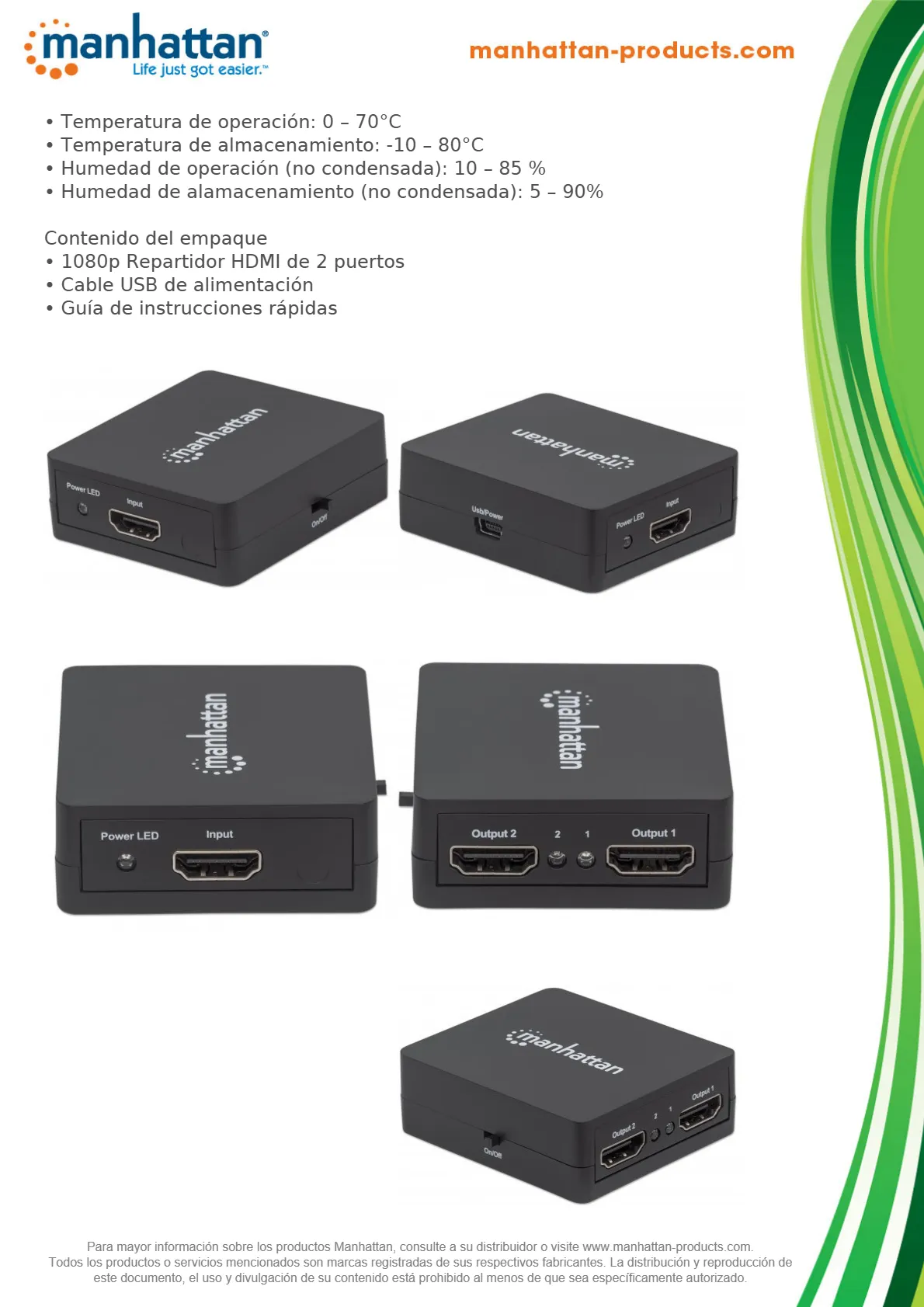 Video Splitter MANHATTAN / x2 HDMI, x1 USB Mini-B / DTV-HDTV 1080p / 2 Puertos De Video / Color Negro