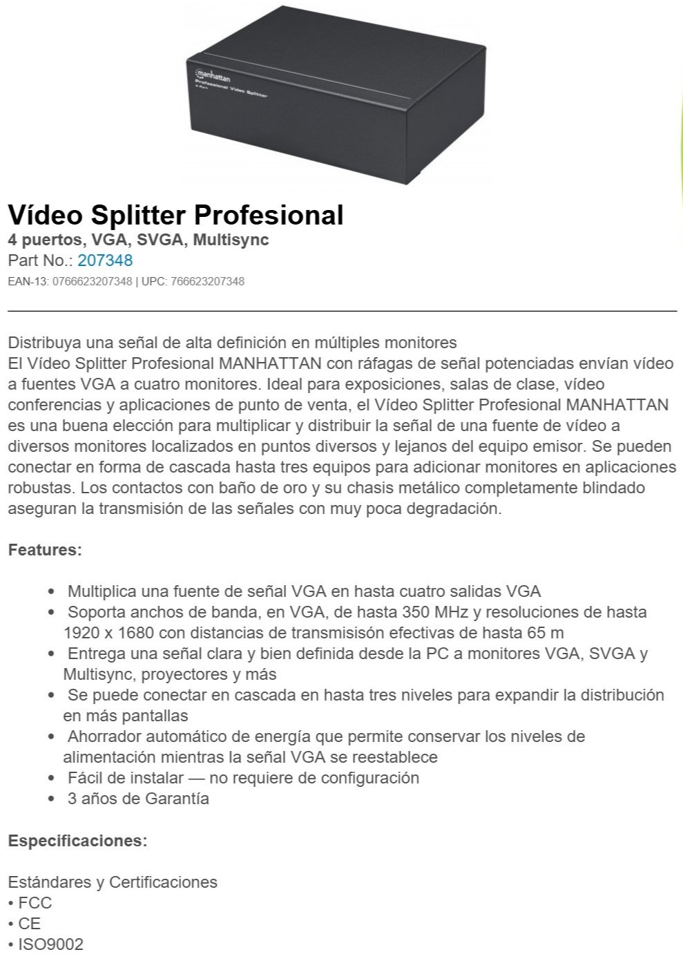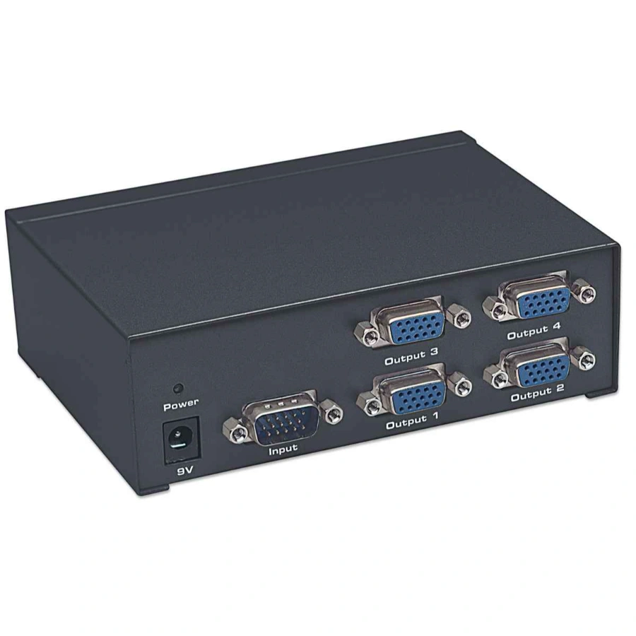 Video Splitter Profesional MANHATTAN 207348 / X1 VGA IN, X4 VGA OUT / Macho A Hembra / Hasta 1080P FHD / Alta Definición / Color Negro