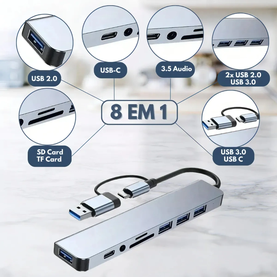 Hub Usb C SUPPORT BC – 8 En 1, Multipuertos, Con Lector TF/SD, Usb 3.0, Audio, USB Tipo C