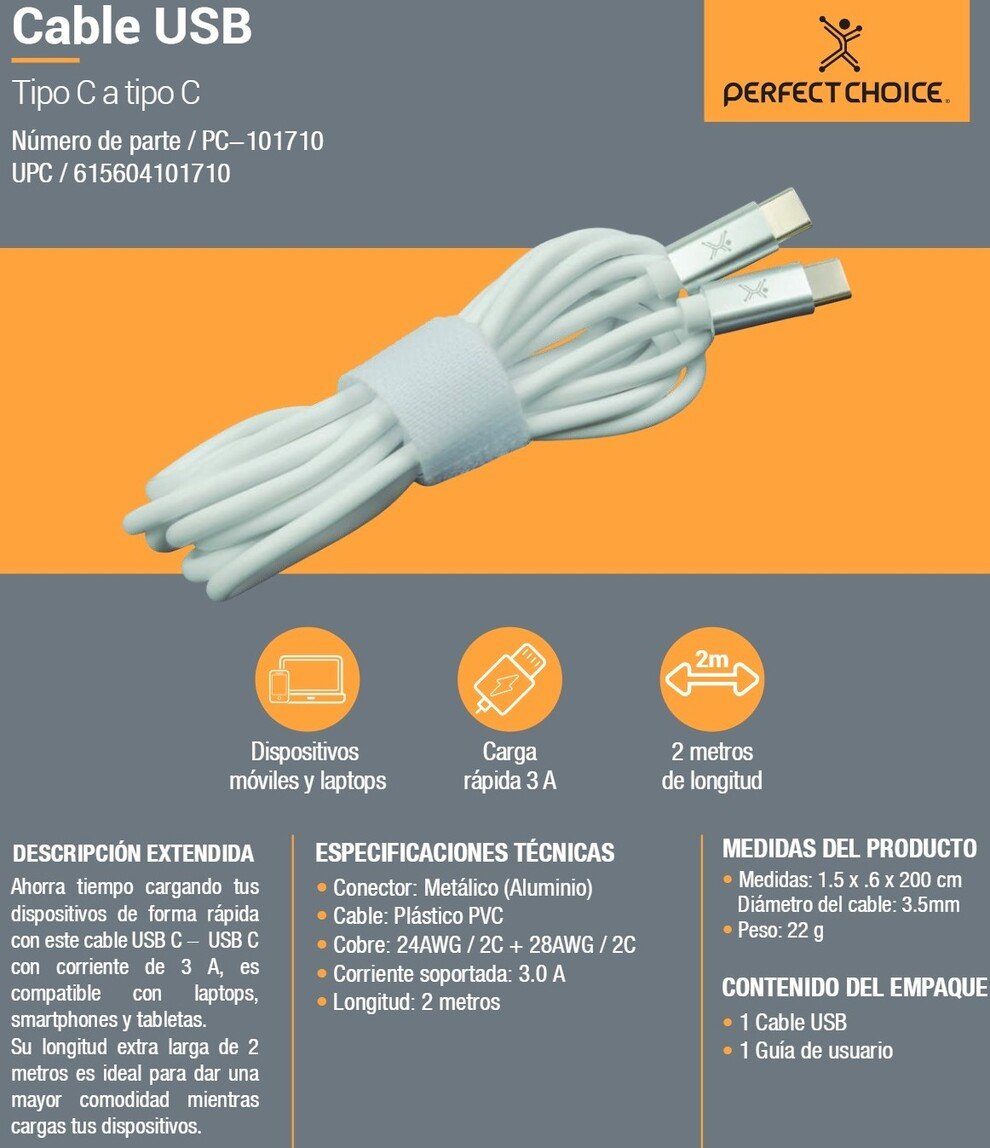 Cable PERFECT CHOICE PC-101710 / USB-C / Macho A Macho / Carga Rápida 3A / 28 AWG / 2 Metros / Color Blanco