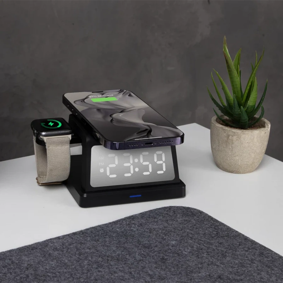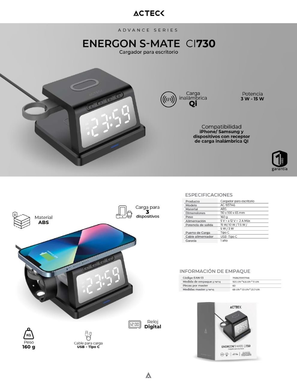 Cargador ACTECK ENERGON S-MATE CI730 / Inalámbrico / De Escritorio / Carga USB, USB-C / Reloj Digital / Carga 3 Dispositivos / Para IPhone, Samsung / Negro