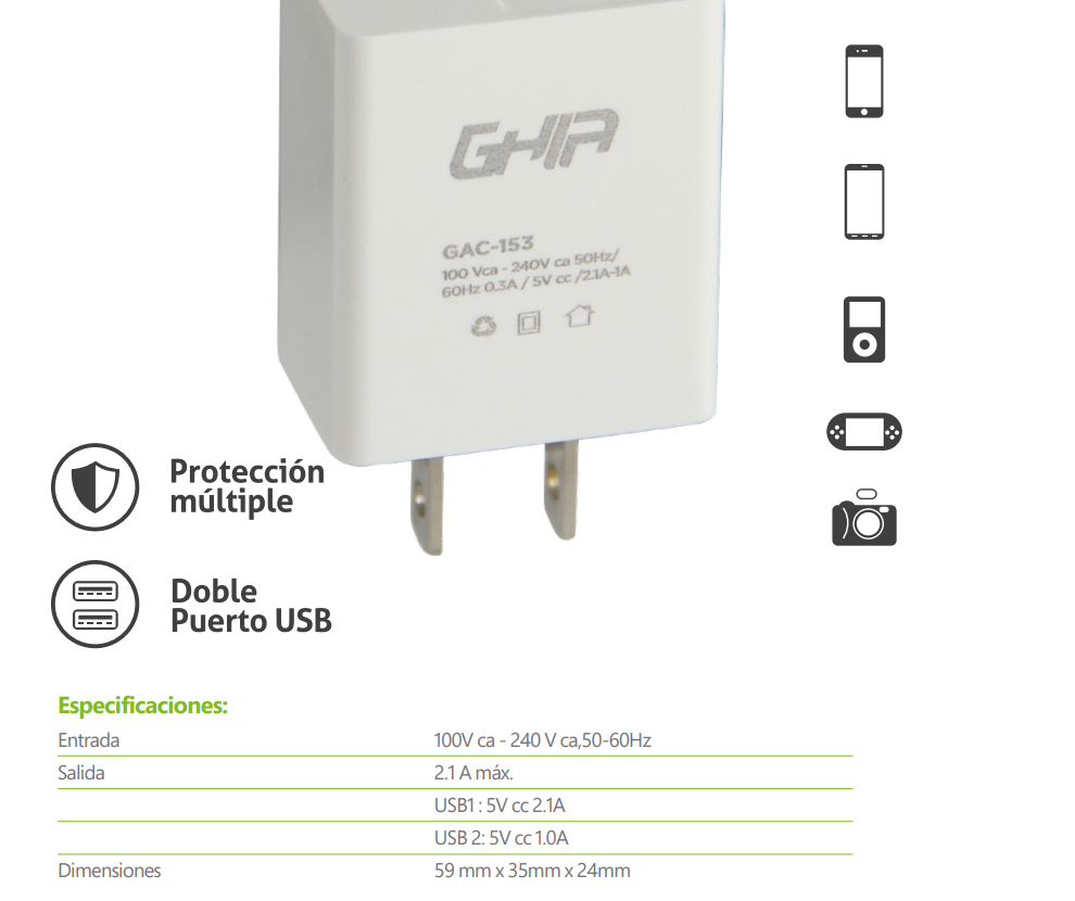 Cargador De Pared GHIA / Con Dos Salidas USB-A 2.1A – 1.0A / 100V CA – 240 V CA / Blanco / GAC-153