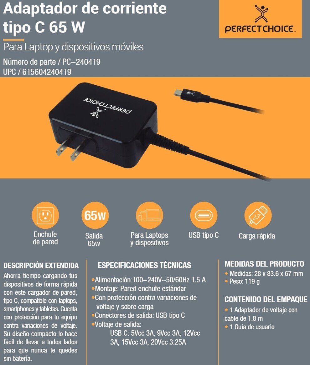 Cargador De Pared PERFECT CHOICE PC-240419 / Para Laptops Y Dispositivos Móviles / Tipo C / Cable 1.8 M / 65W / 240 V / Negro