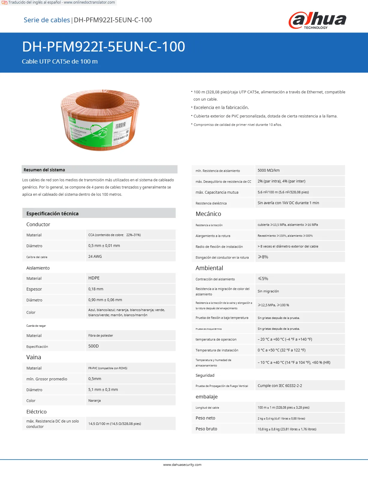 Bobina DAHUA DH-PFM922I-5EUN-C-100 / UTP CAT 5E / Interiores / 100 Metros / Blanco