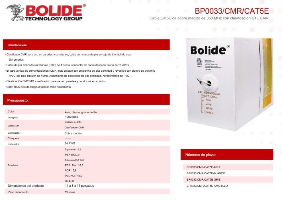 Bobina De Cable UTP BOLIDE BP0033 / CAT5E / Calibre 24 AWG / 100 Mts / Cobre Macizo / Azul