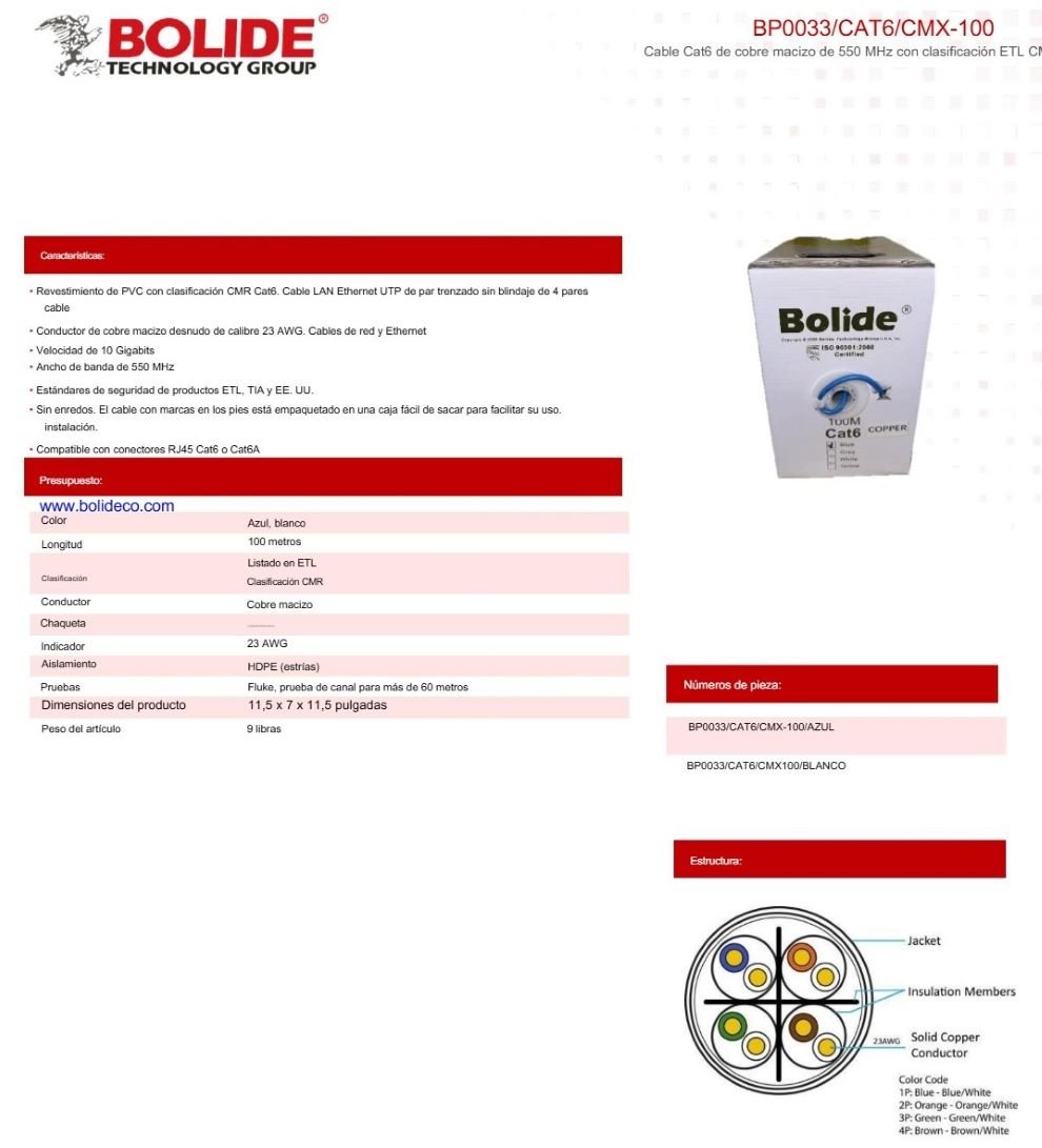 Bobina De Cable UTP BOLIDE BP0033 / CAT6 / Calibre 23 AWG / 100 Mts / 100% Cobre / Azul