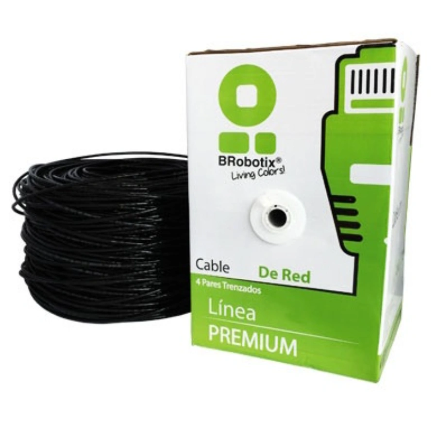La Bobina de Cable Cat5e UTP de Robotix es un producto diseñado para la transmisión de datos en redes Ethernet. Con una longitud total de 305 metros, este cable está recubierto por una chaqueta fabricada con cloruro de polivinilo (PVC) y su color exterior es negro.