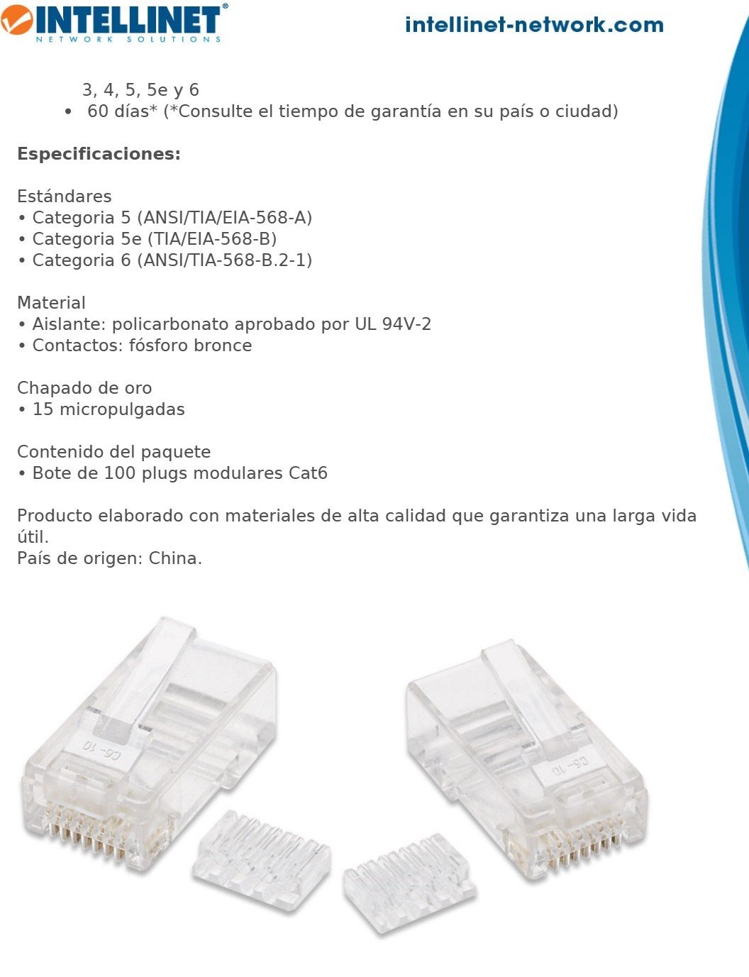 Bote De Plugs Modulares RJ45 Cat6 INTELLINET / 100 Piezas / Contactos C/Chapa De Oro A 15 Micras / Transparente