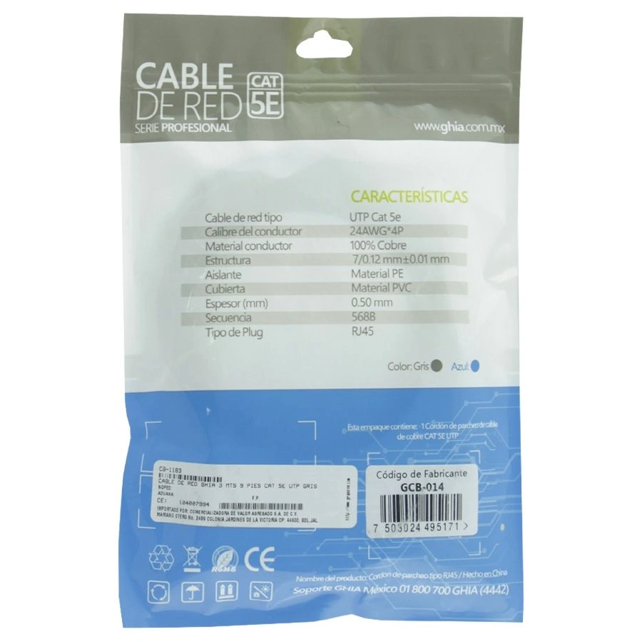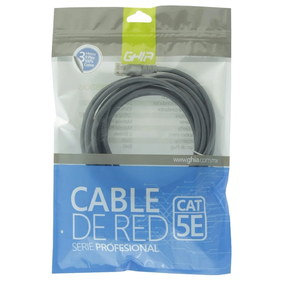Cable De Red GHIA RJ45 / UTP / Cat 5e / 100% Cobre / 3m / Gris