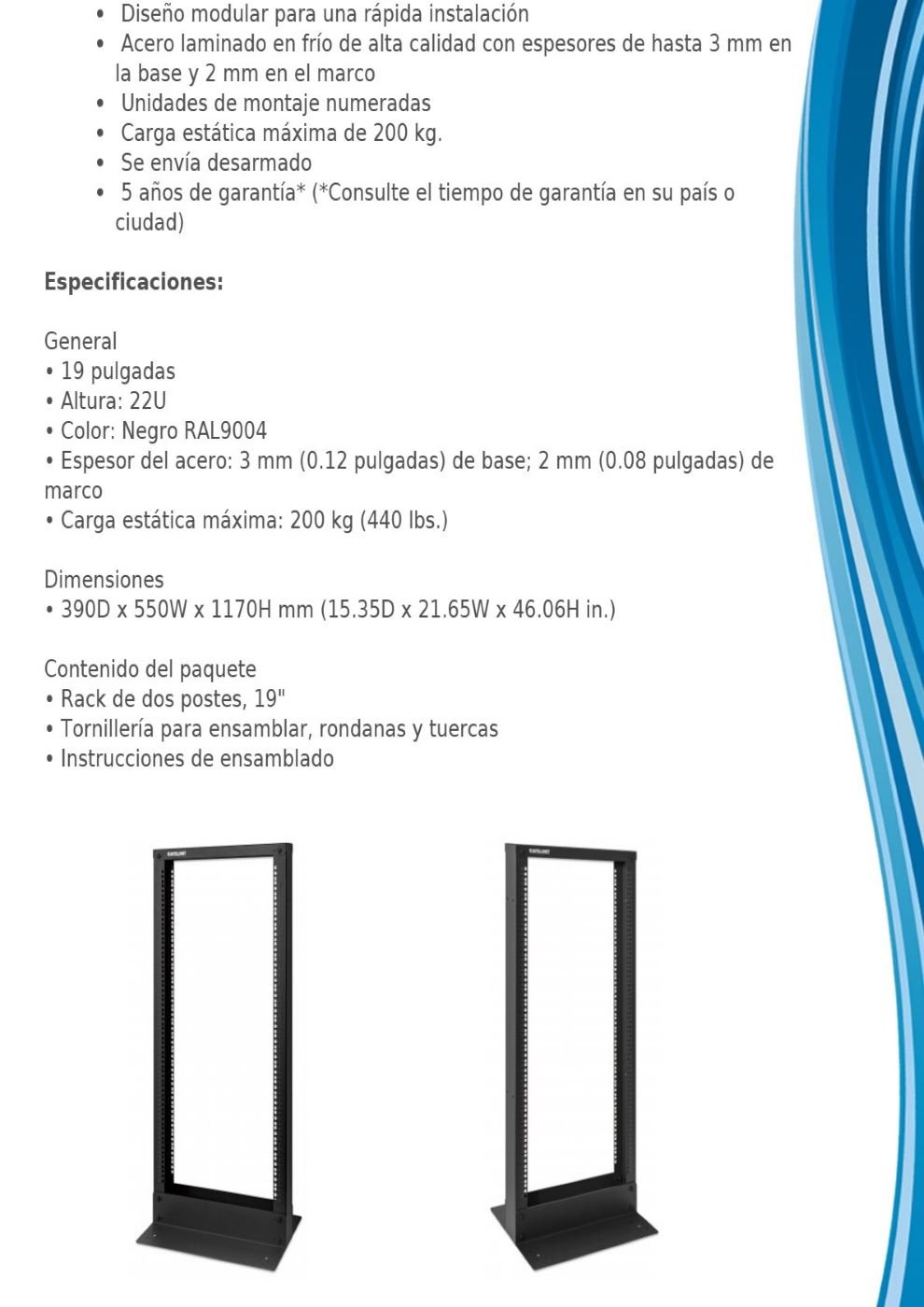 Rack INTELLINET 715966 / Dos Postes / 19″ / Peso Máx. 200 Kg / Acero / Color Negro