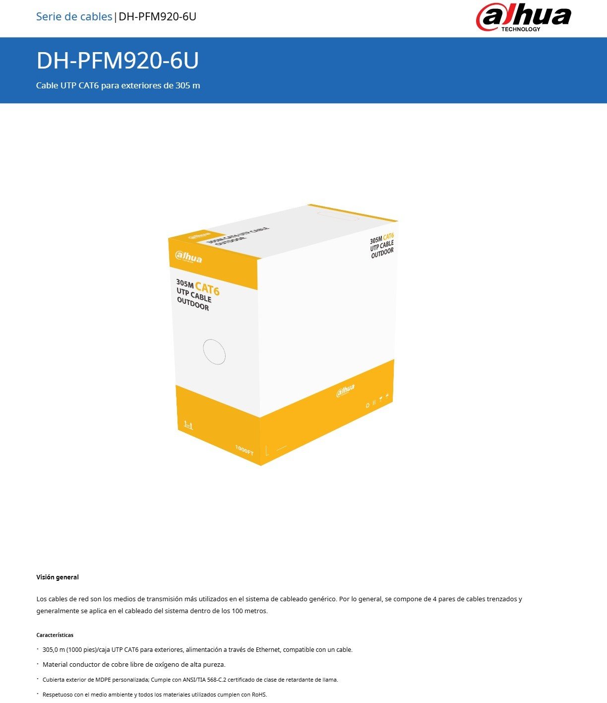 La DAHUA PFM920-6U es una bobina de cable UTP Cat6 diseñada para uso en exteriores. Fabricada con 100% cobre, garantiza alta conductividad y rendimiento. Tiene una longitud de 305 metros y una cubierta de MDPE resistente a condiciones adversas. Cumple con estándares ANSI/TIA 568-C.2 y RoHS, y es retardante de flama. Ideal para redes exteriores, sistemas de cámaras de seguridad y proyectos de infraestructura, ofrece alta velocidad, durabilidad y seguridad en su instalación.