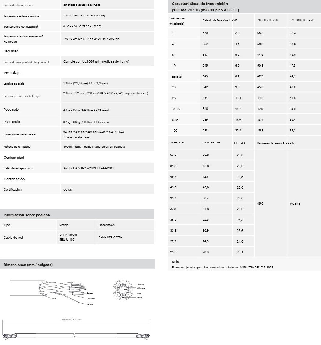 La bobina PFM920I-5EU-U-100 está compuesta por cable UTP de categoría 5E, el cual está constituido por 99.99% de cobre en los conductores (4 pares), este cable es fabricado por Dahua para soluciones de HDCVI e IP principalmente, generalmente se aplica en el cableado del sistema dentro de los 100 metros.