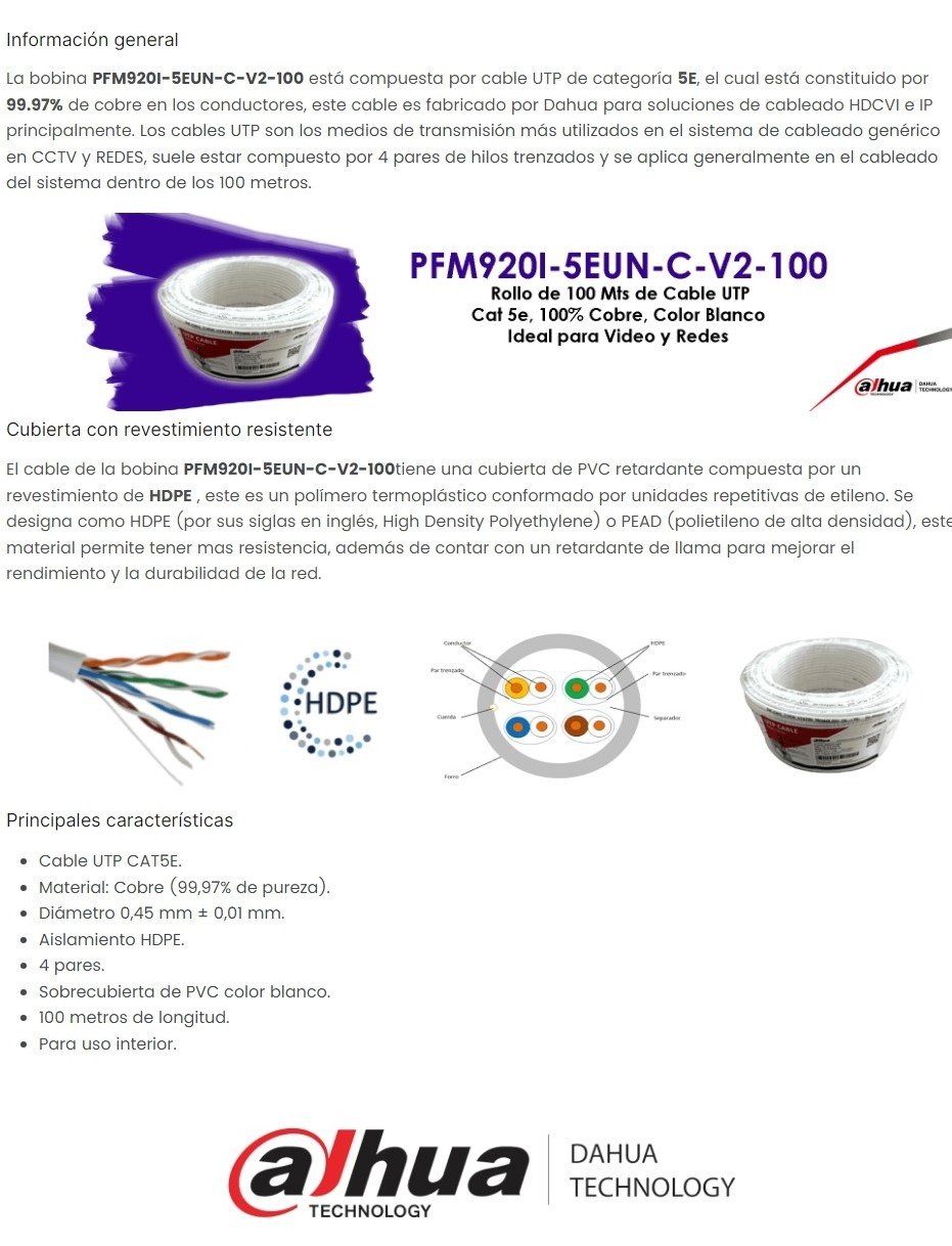 Sé el primero en valorar “Bobina De Cable UTP DAHUA DH-PFM920I-5EUN-C-V2-100 / UTP / 100% Cobre / CAT 5e / Uso Interior, Para Redes Y Video / 100Mts / Blanco”