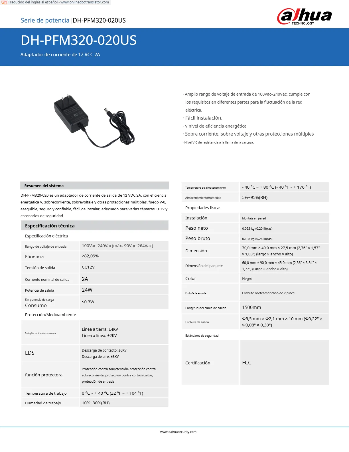 Fuente De Poder DAHUA DH-PFM320-020US / De 12 V / 2 Amper / Especial Para Cámaras De Cctv / Cable De 1.5 Metros / Certificación Fc / Negro