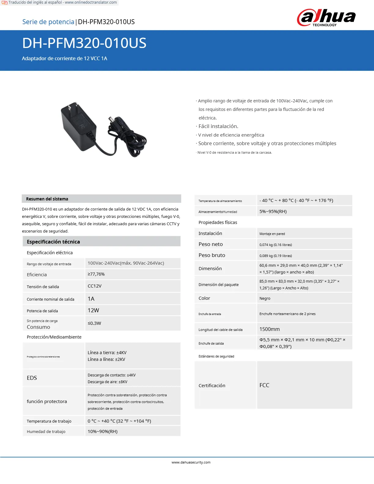 Fuente De Poder DAHUA PFM320-010US / 12 V / 1 Amper / Protección De Sobre Corriente Y Voltaje / Negro