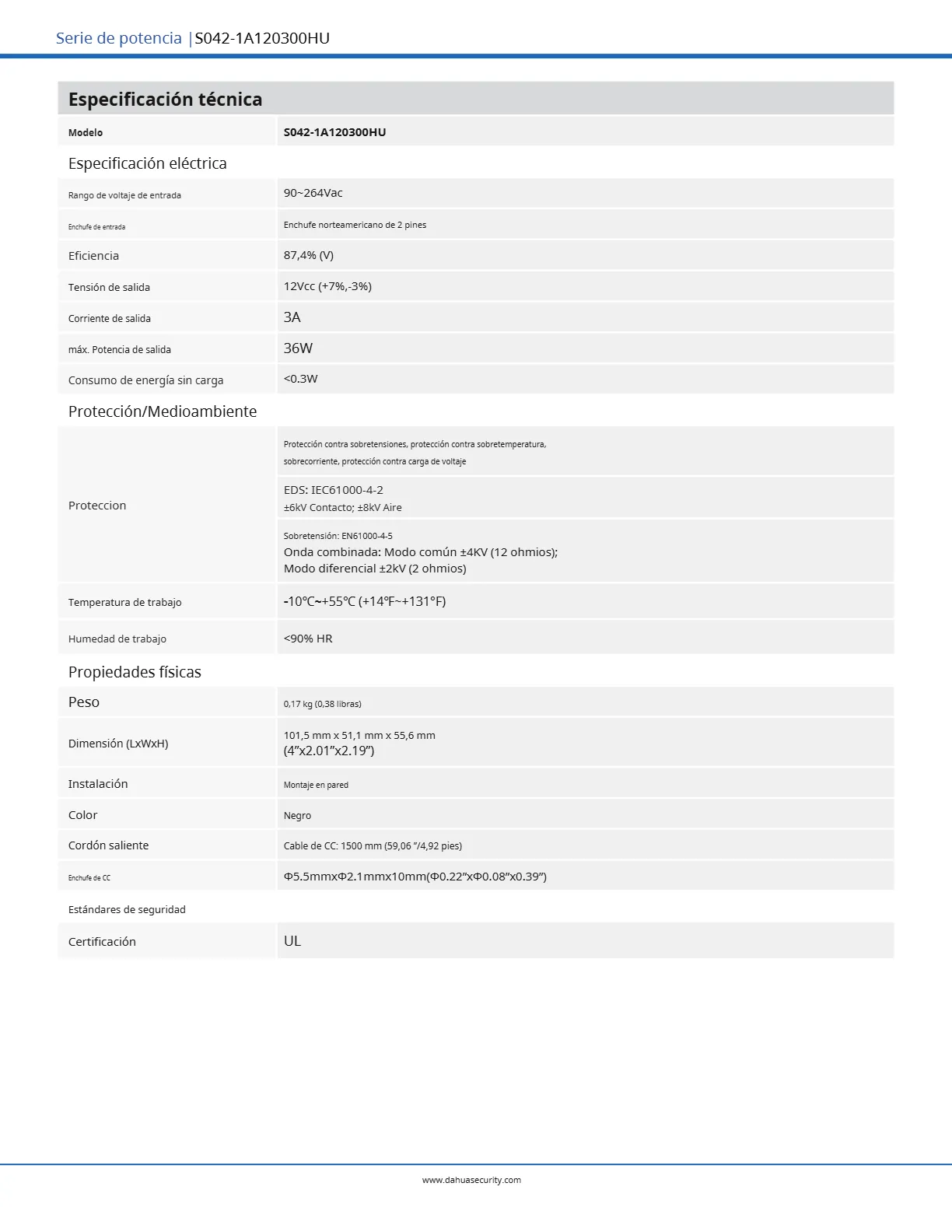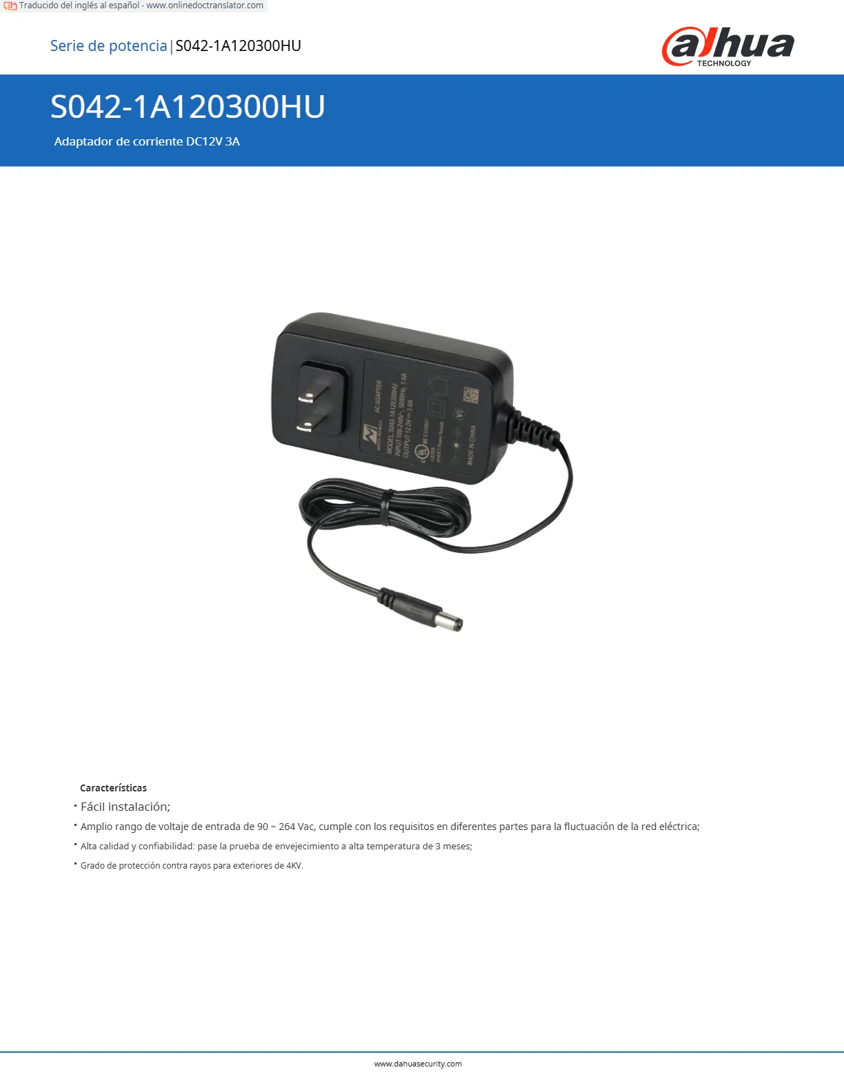 Fuente De Poder DAHUA S042-1A120300HU / De 12 V / 3 Amperes / Certificación Ul / Negro