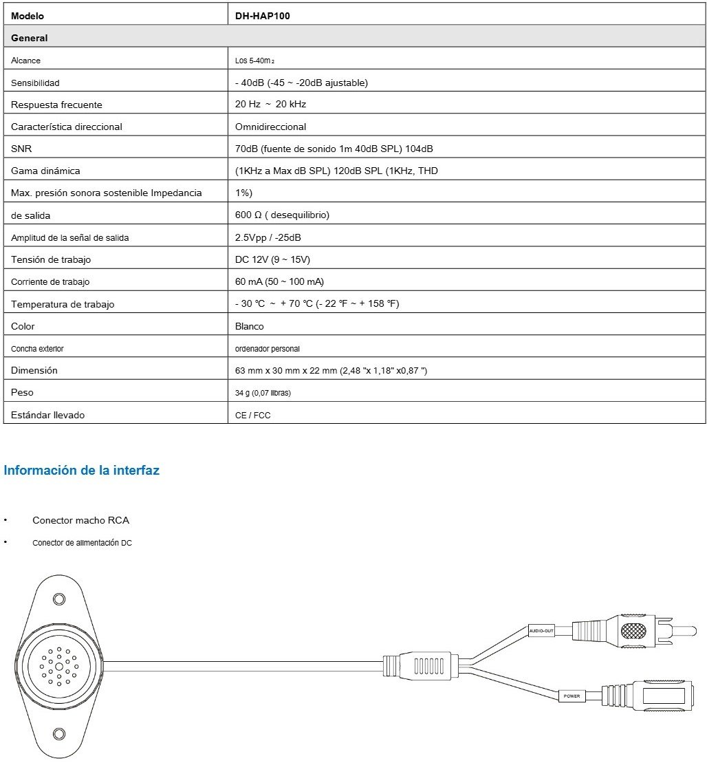 Micrófono de Vigilancia DAHUA DH-HAP100 / 40 M2 / SNR 70 Db / Alta Fidelidad / Rango Dinámico 104 Db / Presión de Sonido Máximo 120 Db / Blanco