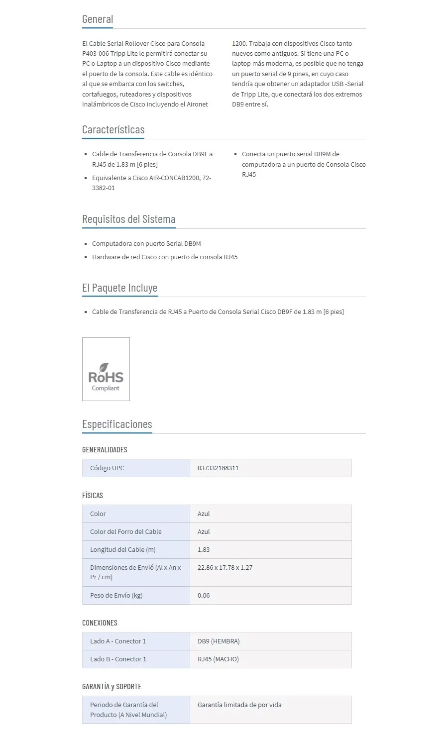 • Cable de Transferencia de Consola DB9F a RJ45 de 1.83 m [6 pies]