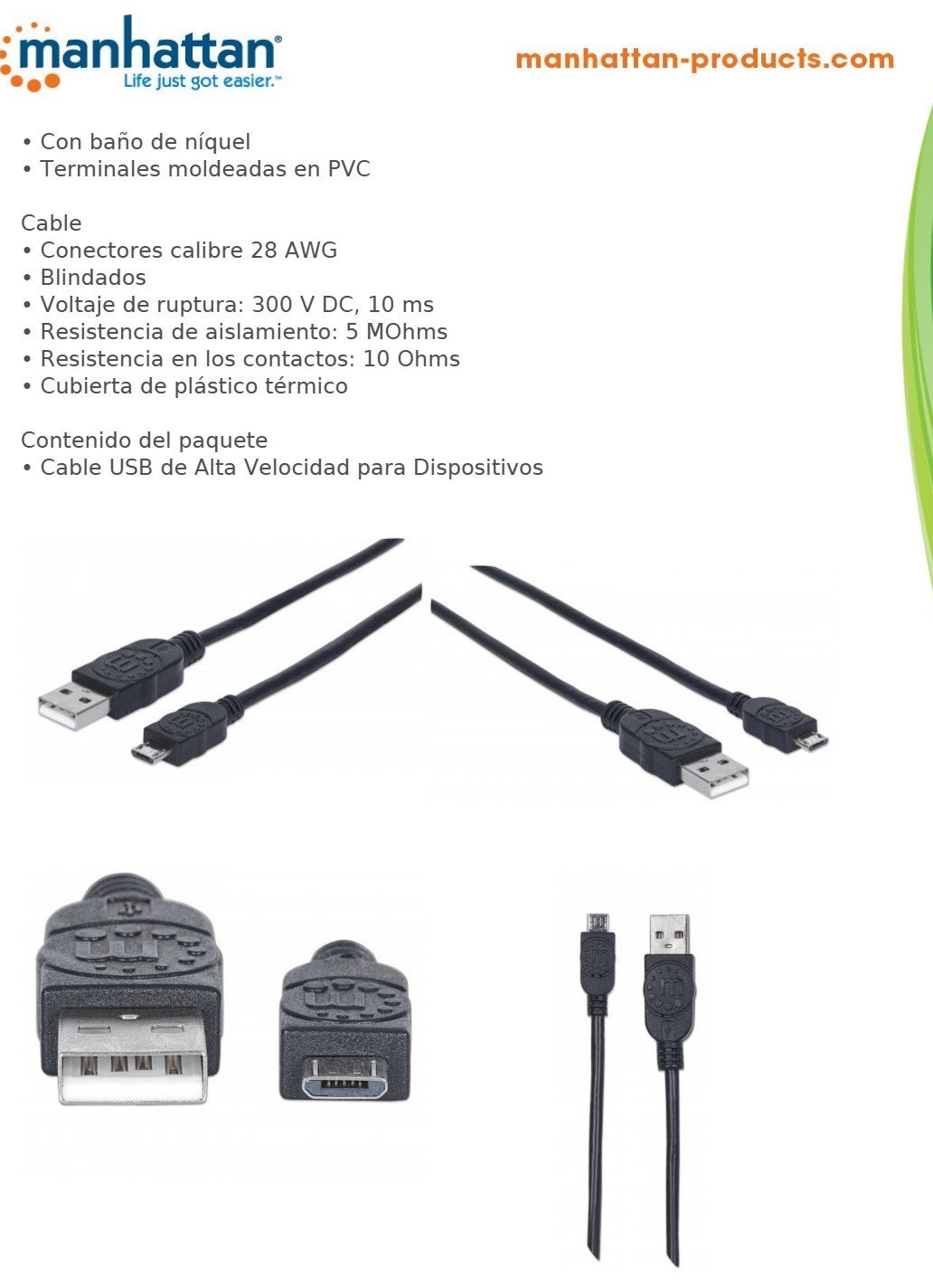 Cable USB de Alta Velocidad MANHATTAN / A Macho – Micro-B Macho / 3m / Hasta 480 Mbps / Negro
