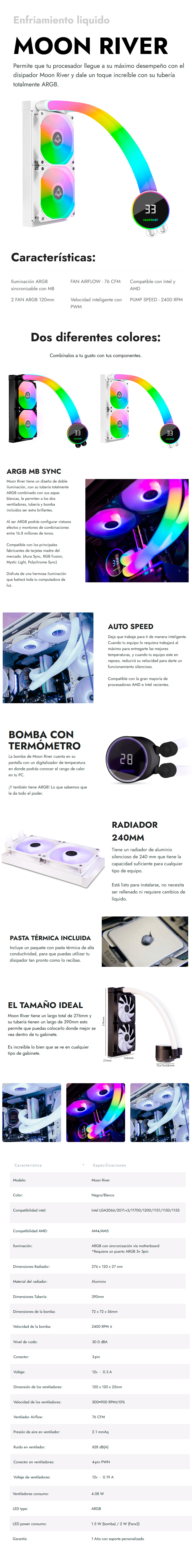 Enfriamiento Liquido AIO MUNFROST Moon River 240 ARGB – 240mm, 2x120mm, Hasta 2400 RPM, 76 CFM, 28 dBA, 4pin 12V, 3pin 5V – Blanco