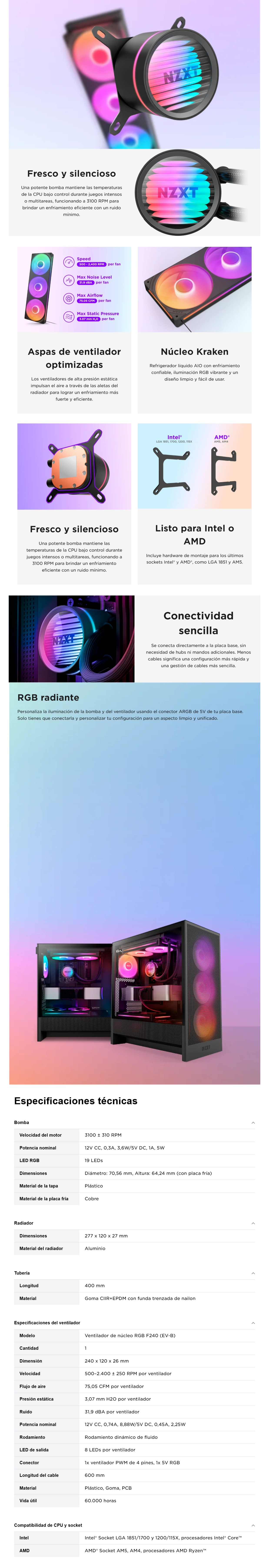 Enfriamiento Liquido AIO NZXT Kraken Core 240 RGB – 240mm, 2x120mm, Hasta 3100 RPM, 75.05 CFM, 31.9 dBA, 4pin 12V, 3pin 5V – Negro