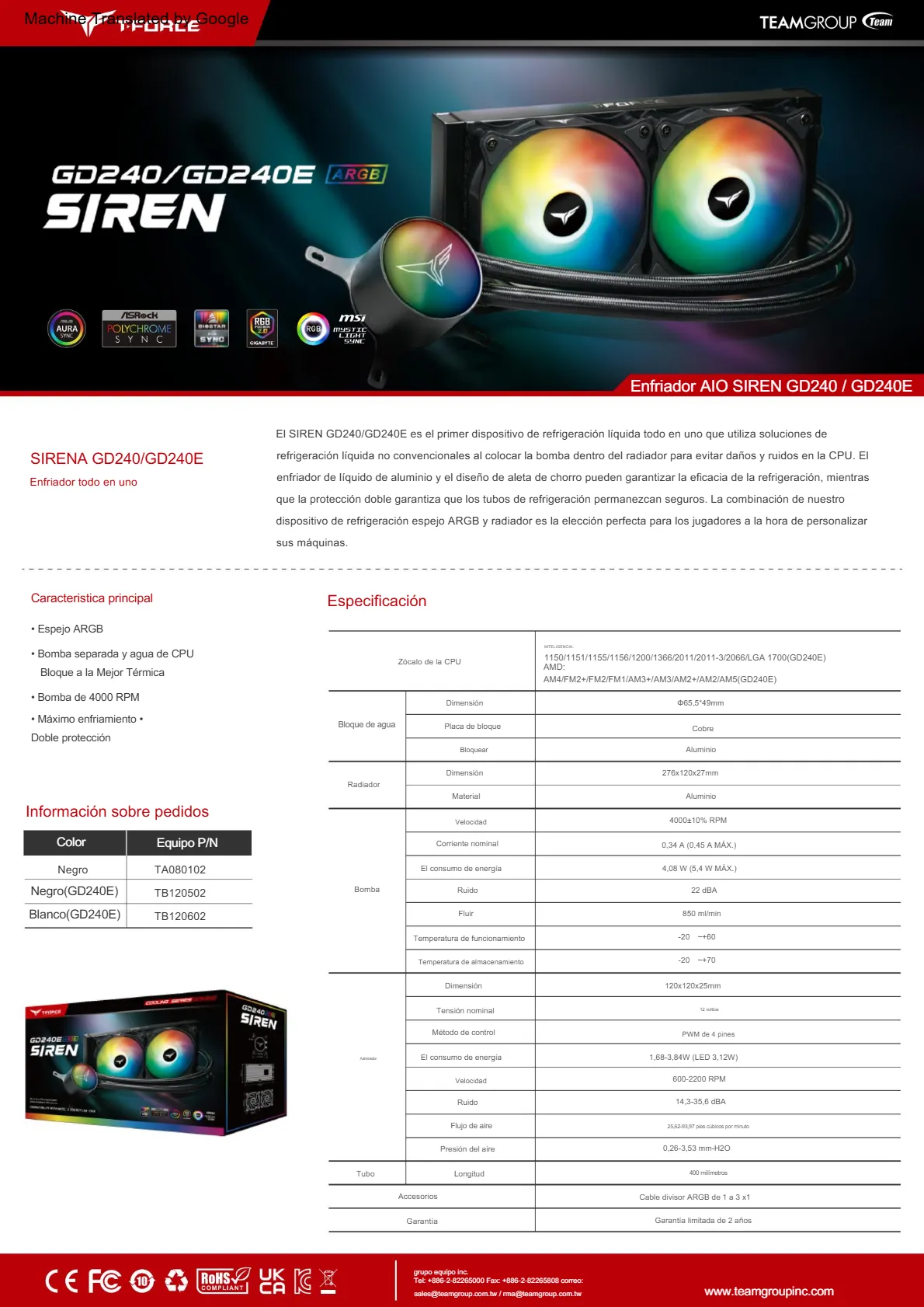 Enfriamiento Liquido AIO TEAMGROUP T-FORCE GD240E SIREN ARGB 240MM