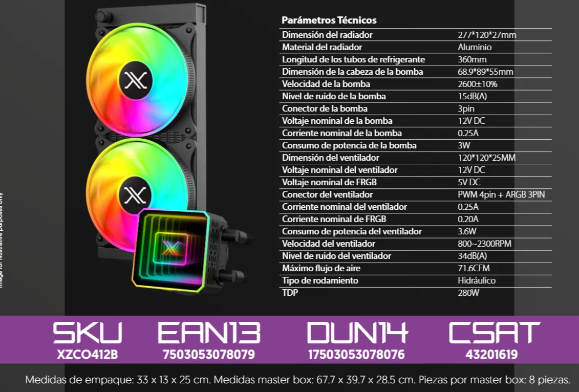 El Enfriamiento Líquido Xzeal Vostok 240 ofrece un rendimiento de refrigeración superior con dos ventiladores de 120mm y un flujo de aire de 71.6 CFM para mantener temperaturas óptimas incluso en las sesiones más intensas. Su bomba silenciosa de 2600 RPM y un nivel de ruido de solo 34 dB(A) aseguran un funcionamiento eficiente y discreto. Compatible con sockets Intel y AMD