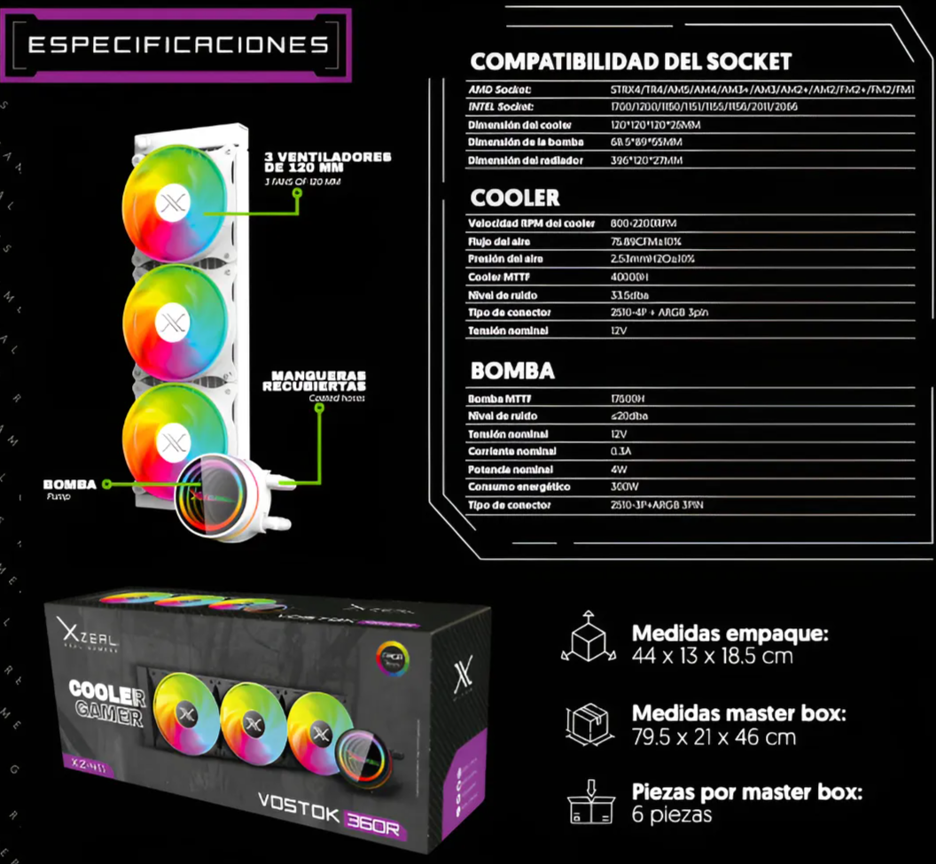 Enfriamiento Liquido AIO XZEAL VOSTOK 360R ARGB / AMD-INTEL / 800-2200 RPM / 75.89CFM / 33.5dBA / 3Pin, 12V / TDP Hasta 300W / Negro