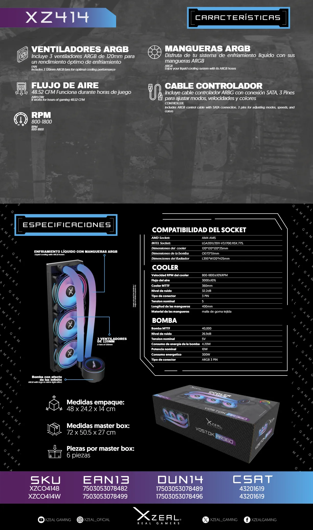 Enfriamiento Líquido AIO XZEAL VOSTOK AR360 – 360mm, 3x120mm, Hasta 1800 RPM, 48.52 CFM, 32.2 dBA, 3pin 5V, Mangueras ARGB – Negro