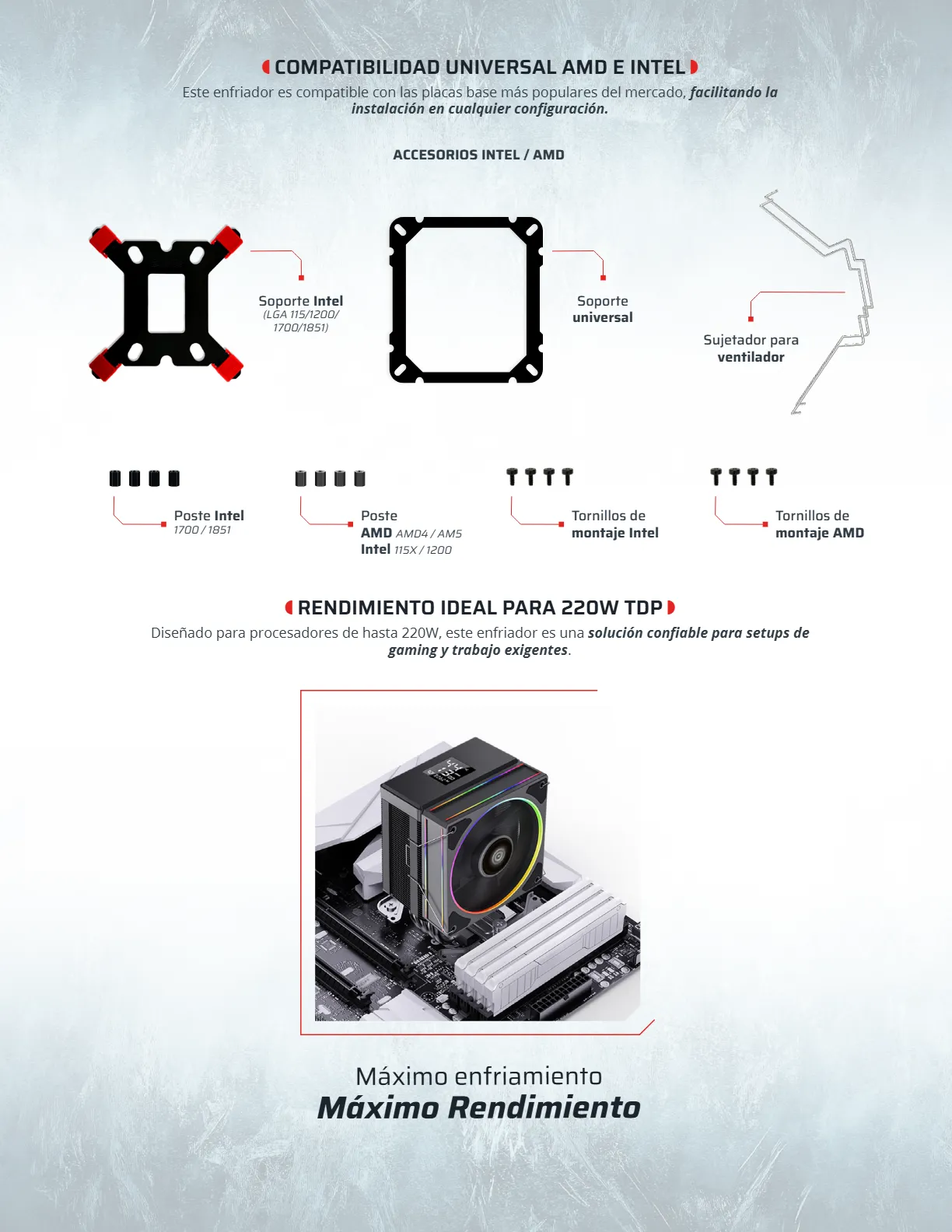 Eficiencia de enfriamiento en su máxima expresión. Con 4 heat pipes y un TDP de 220 W, garantiza un rendimiento óptimo para mantener tu procesador fresco. Su ventilador de 120 mm con rodamiento hidráulico y un rango de 600 – 2000 RPM, junto con 74.27 CFM de flujo de aire y un nivel de ruido de solo 30 dB, asegura un enfriamiento eficaz y silencioso.
