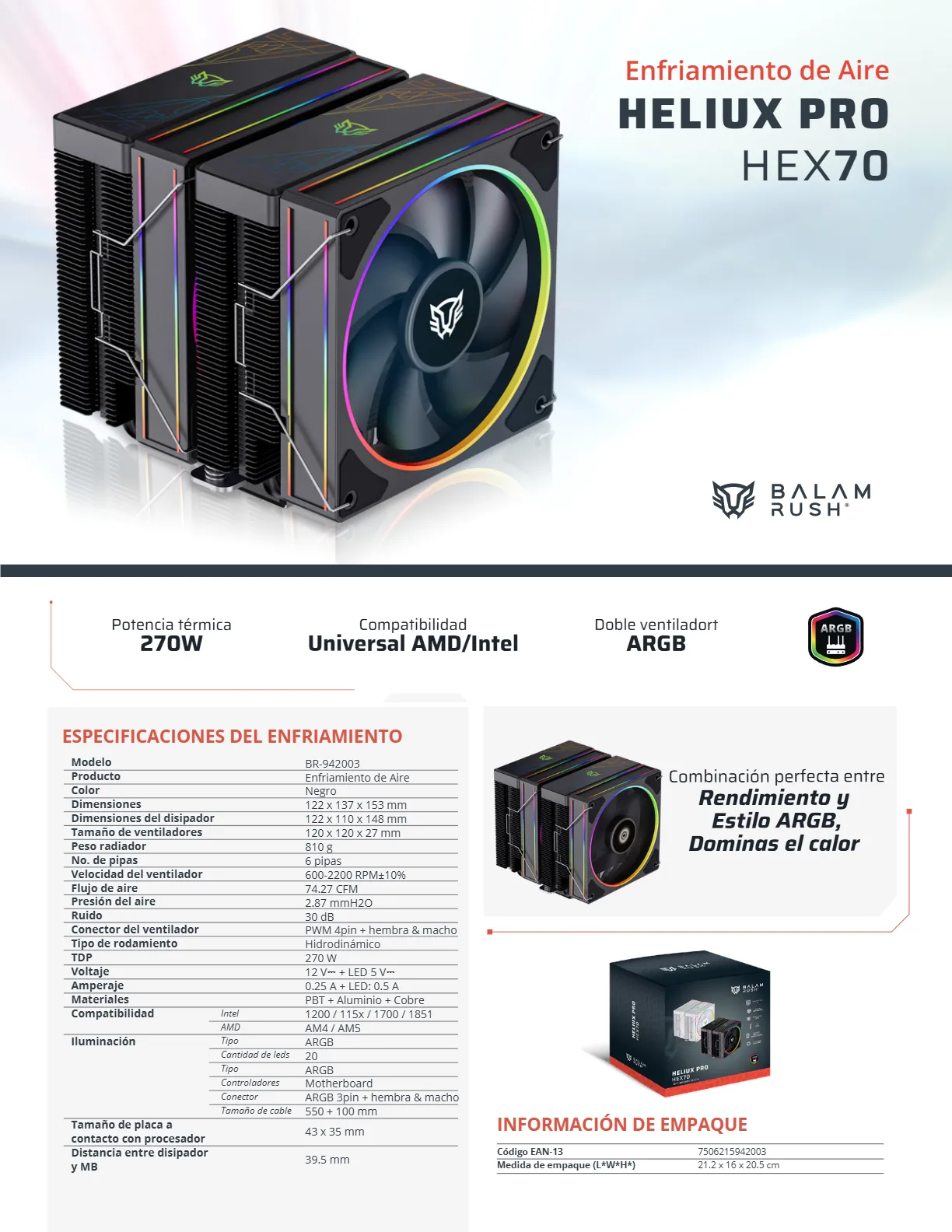Disipador BALAM RUSH Heliux Pro HEX70 – 2 x 120mm, Hasta 2200RPM, INTEL/AMD, 30dBA, 74.27 CFM, 3Pin 5V, 4Pin 12V, Color Negro