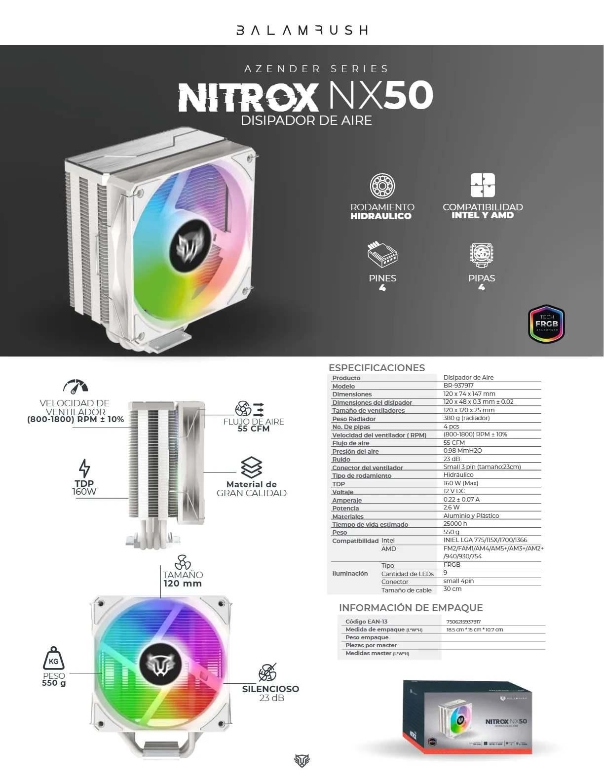 Disipador BALAM RUSH NITROX NX50 / 1 Vent 120mm / AMD, Intel / 1800 Rpm / 55 Cfm / 23 dBA / 4 Pines, 3Pines / Blanco
