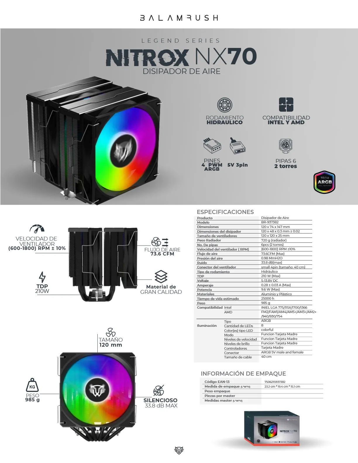 Disipador BALAM RUSH NITROX NX70 / Intel, AMD / X2 Ventiladores 120mm / 1800Rpm / 73.6Cfm / 33.8 dBA / 4Pin, 3Pin 5V ARGB / Negro