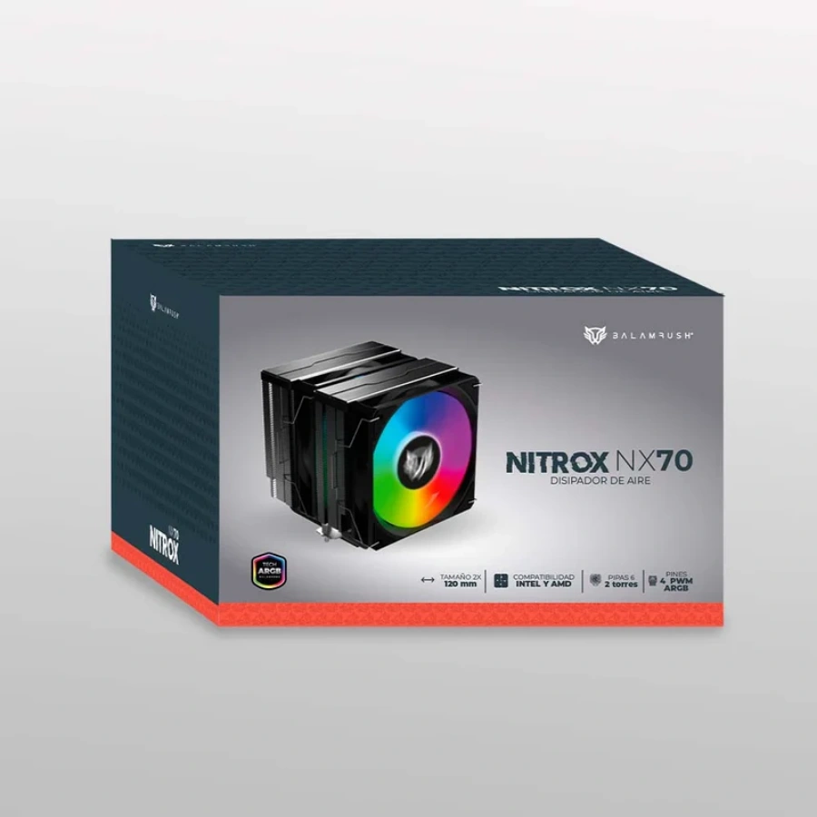 Disipador BALAM RUSH NITROX NX70 / Intel, AMD / X2 Ventiladores 120mm / 1800Rpm / 73.6Cfm / 33.8 dBA / 4Pin, 3Pin 5V ARGB / Negro
