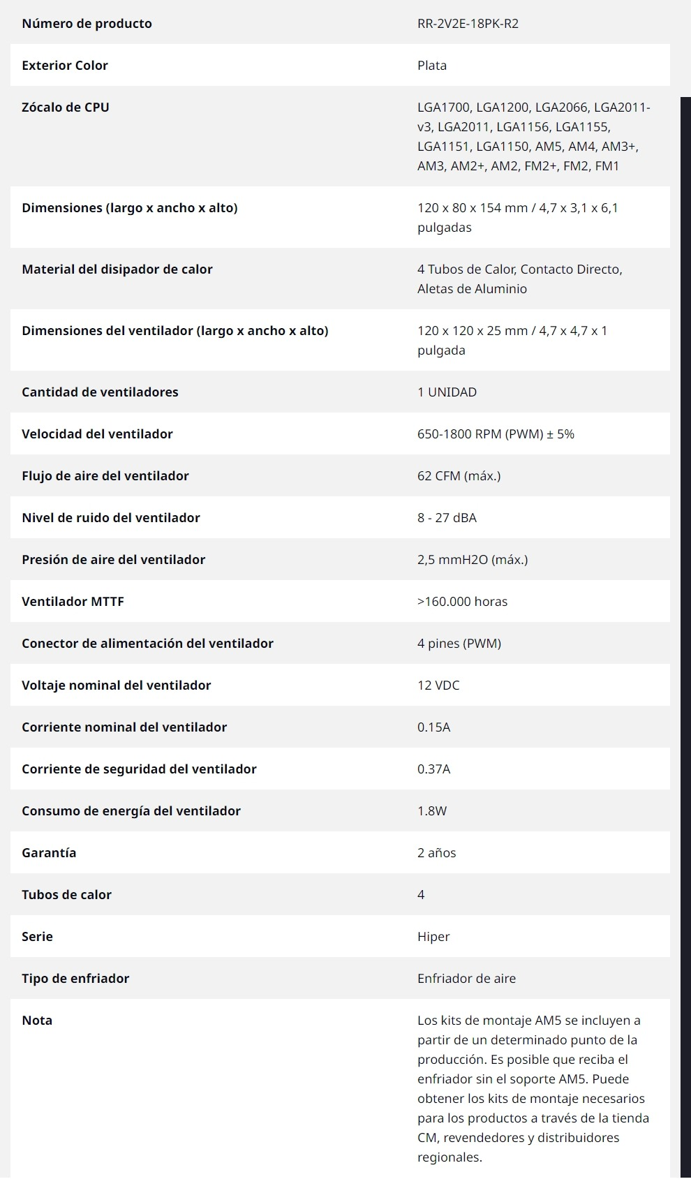 Disipador COOLER MASTER HYPER 212 EVO V2 / Ventilador De 120MM / 650-1800 RPM / 62 CFM / 27 dBA / 4 Pin 12V / Plata Con Negro
