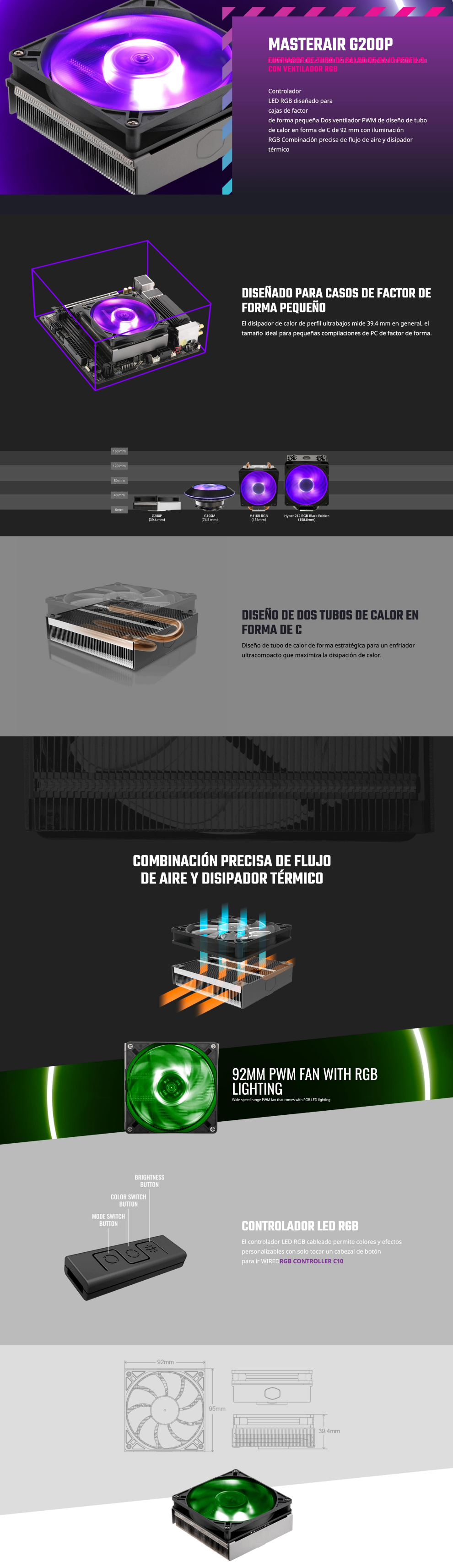 1 valoración en Disipador COOLER MASTER Master G200p Cpu / Ventilador RGB / Factor Forma Pequeña / Controlador Led RGB / 4 Pines / H. 2600 Rpm