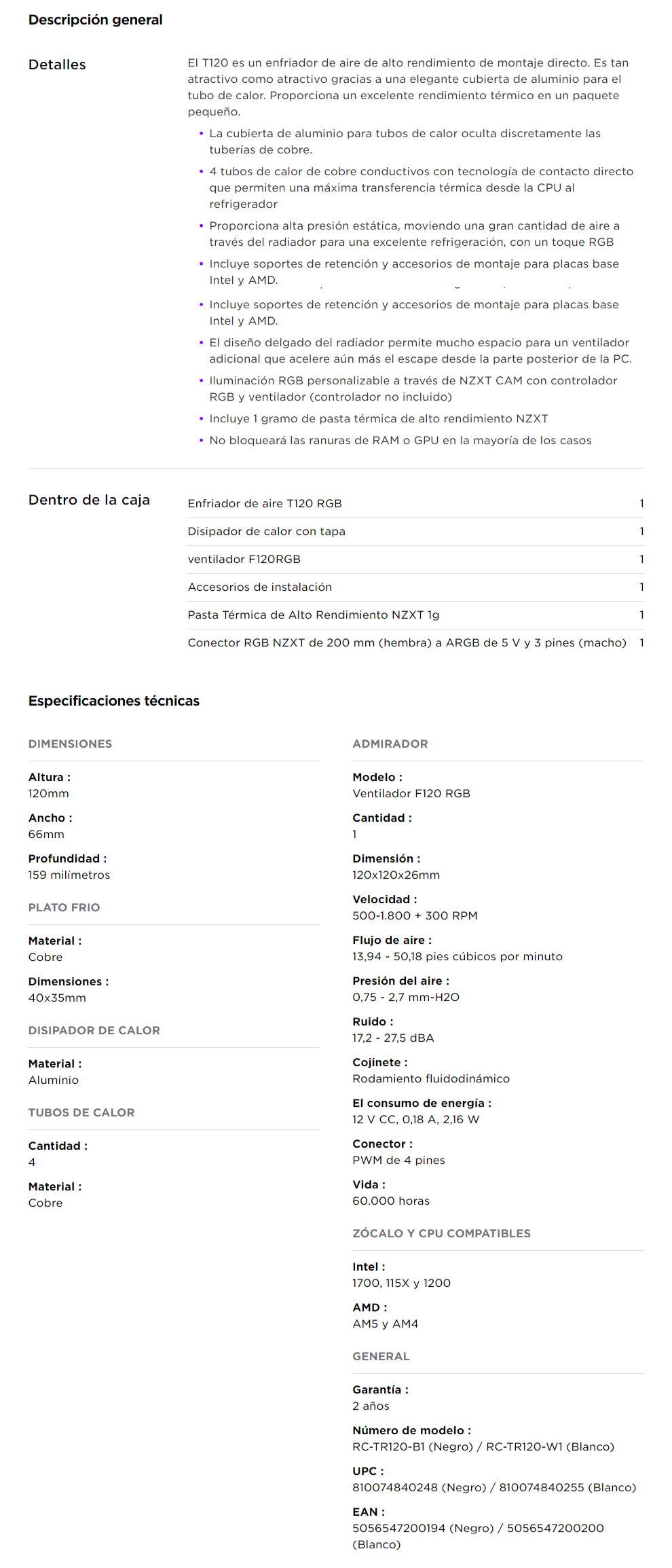 Disipador NZXT T120 RGB / X1 Ventilador 120mm / Intel, AMD / 1800Rpm / 50,18 Cfm / 27,5 dBA / 4Pines / Blanco