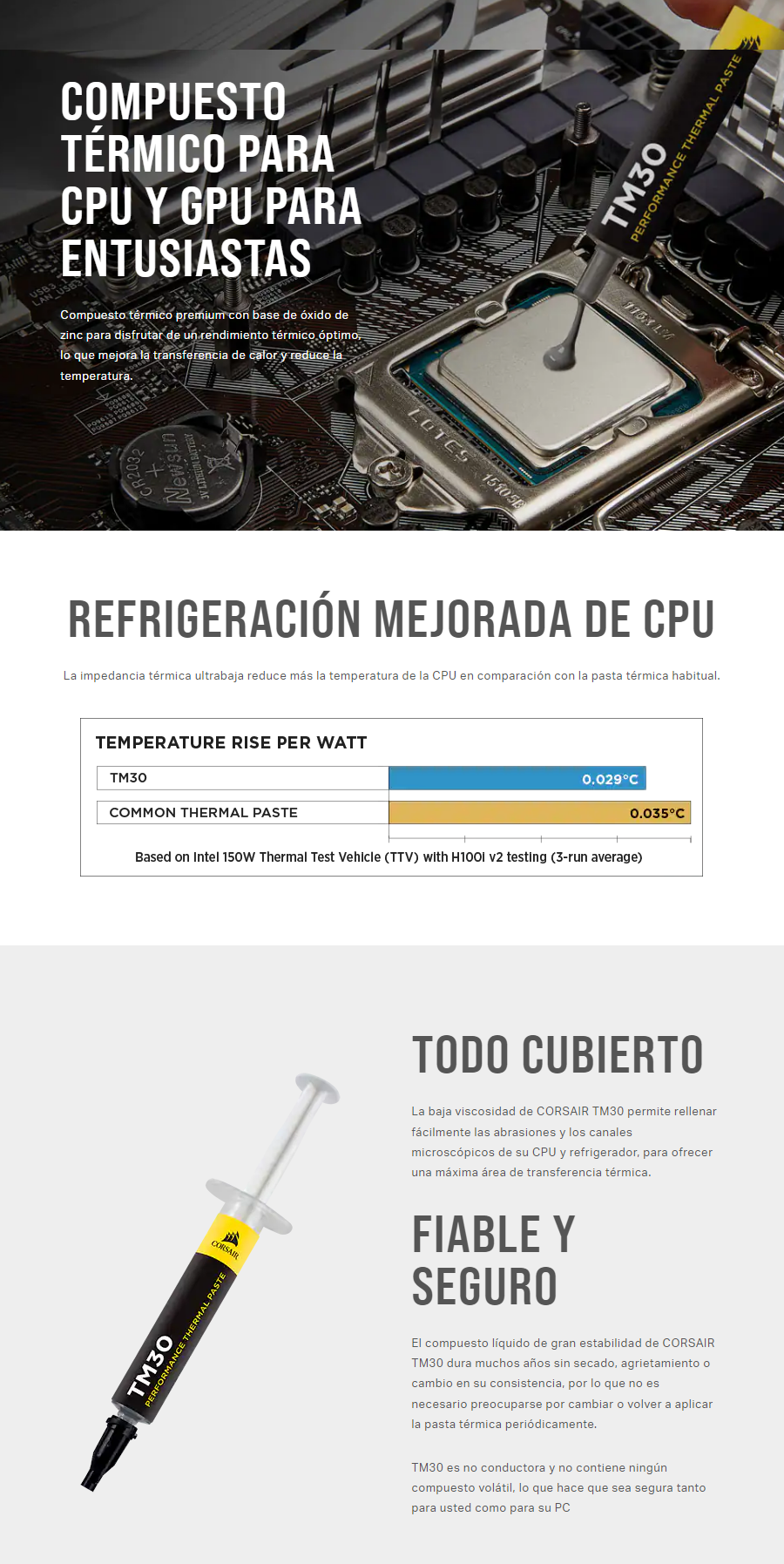 La pasta térmica CORSAIR TM30 le ayuda a obtener el máximo rendimiento de su PC, con un material térmico de óxido de zinc premium de baja viscosidad y fácil de aplicar.