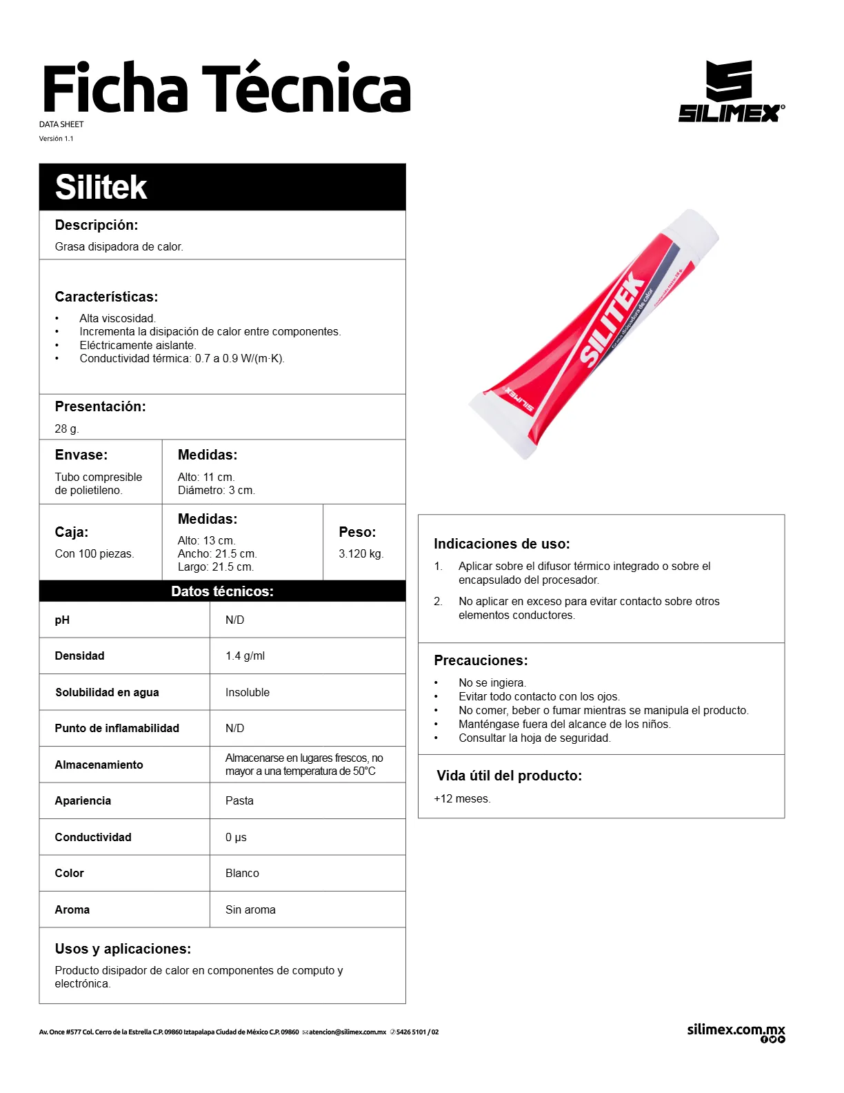 • SiliTek Grasa formulada a base de silicón, disipadora de calor. Presentación Tubo de 28 grs. Aplicaciones Este producto se usa en el montaje de procesadores de computadoras y se aplica entre el procesador y el disipador. Se usa también en elementos electrónicos de potencia como diodos, transmisores, amplificadores y en general todos los mecanismos que al operar generan altos niveles de calor.