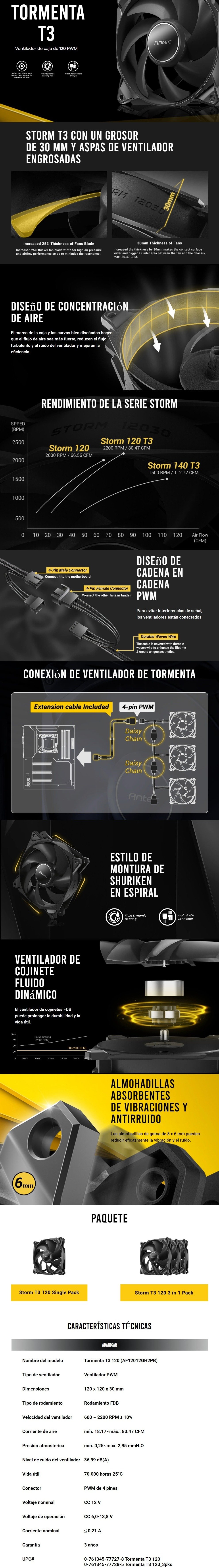 Kit 3 Ventiladores ANTEC TORMENTA T3 / 3 Ventiladores 120mm / 600-2200 RPM / 80.47 CFM / 36.99 dbA / PWM De 4 Pines / Negro