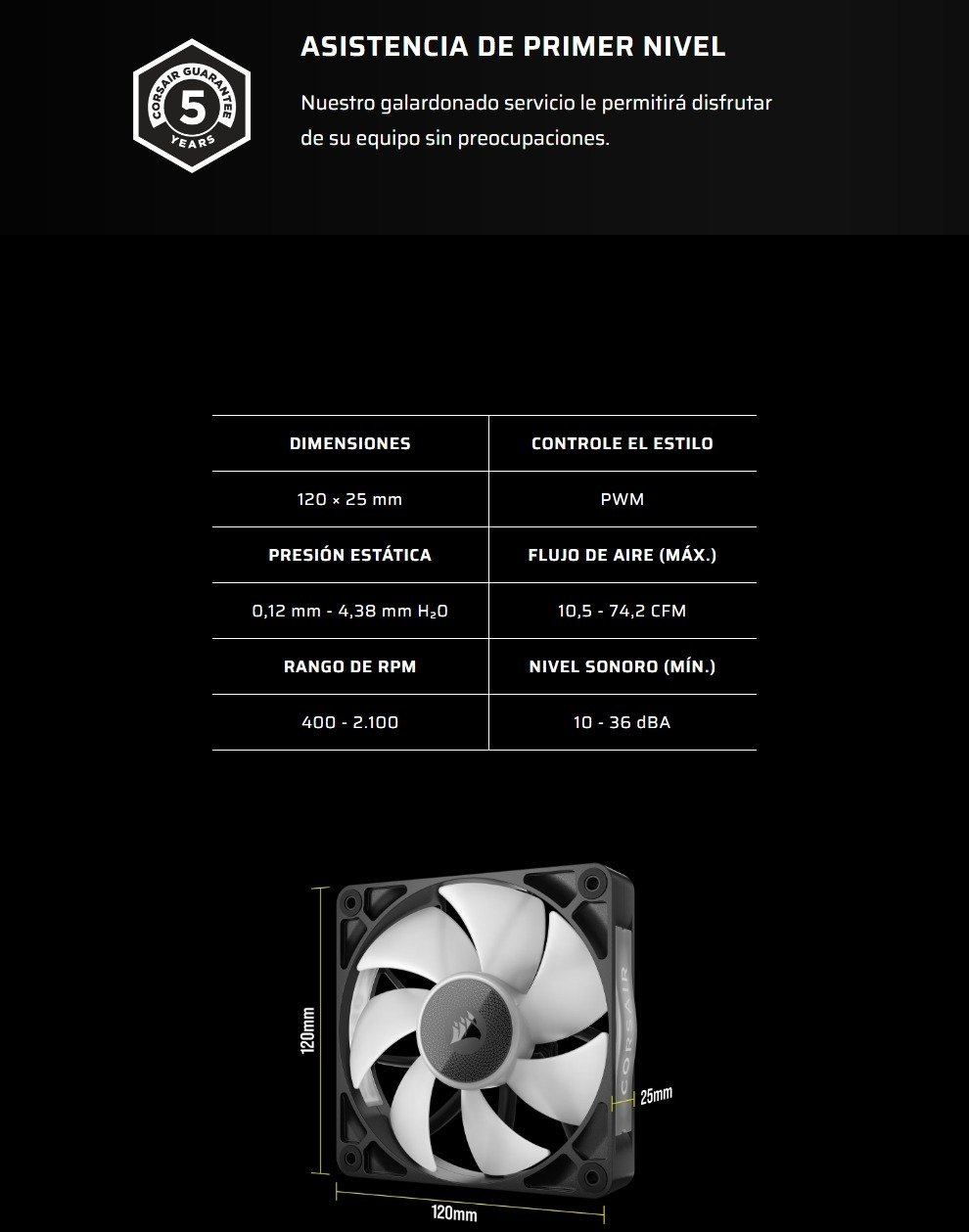Los ventiladores CORSAIR RX120 RGB PWM ofrecen un rendimiento de refrigeración al impulsar un alto flujo de aire a través de obstrucciones con alta presión estática y la tecnología CORSAIR AirGuide.