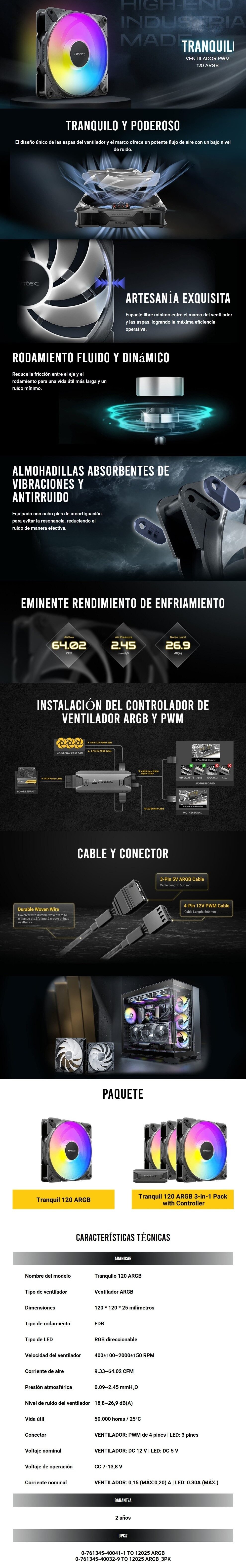 Kit De 3 Ventiladores Antec Tranquil 120 ARGB, 64.02 CFM, Led Multi, Controlador Incluido, PWM de 4 pines, Negro